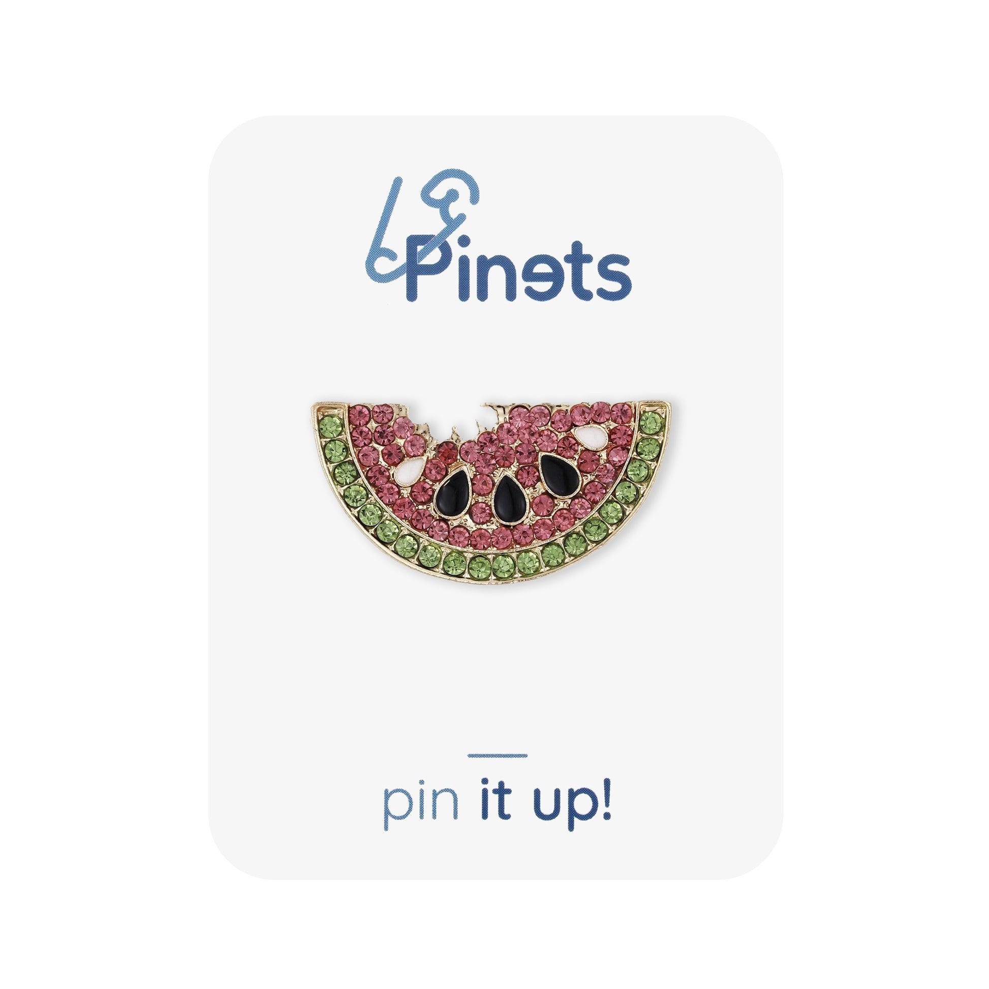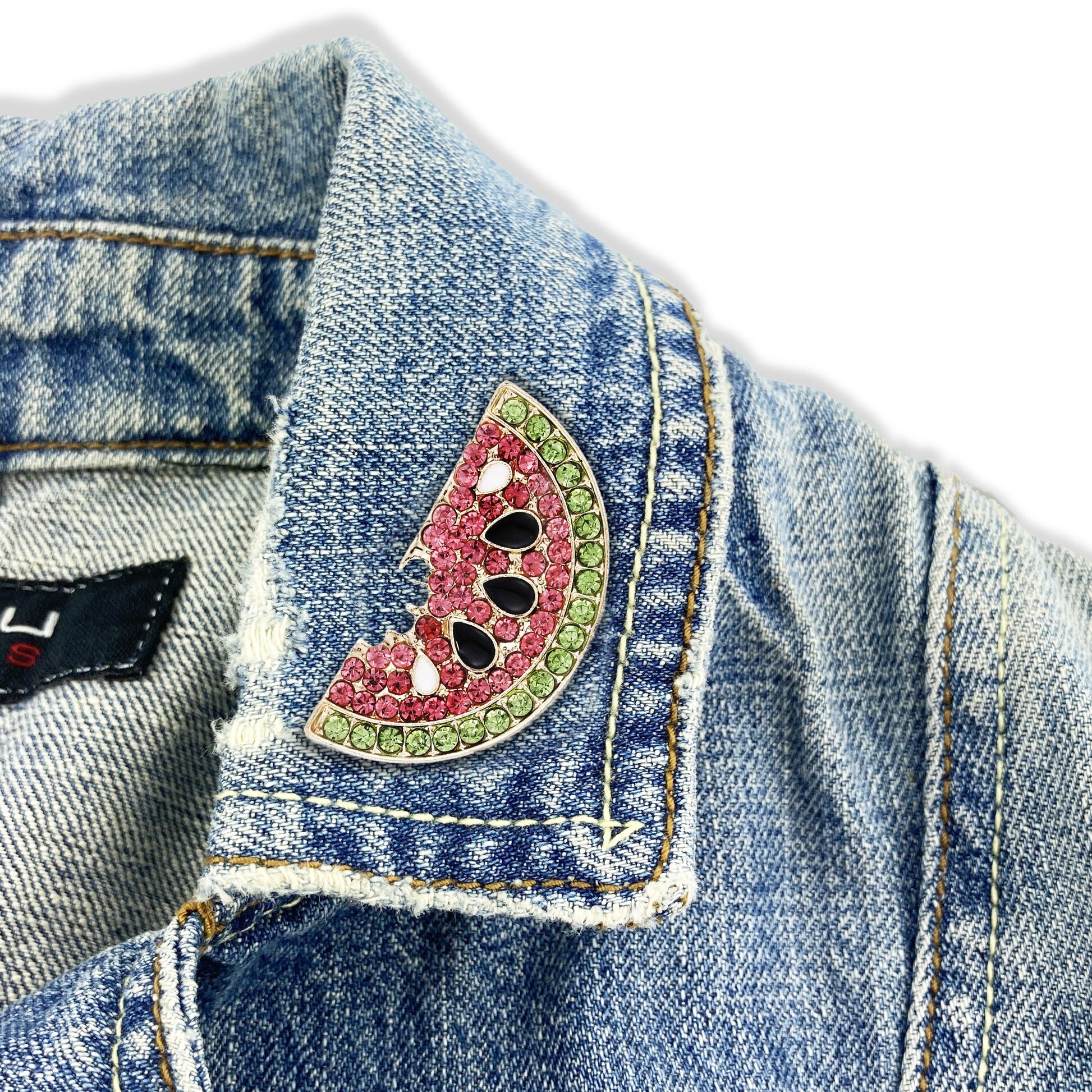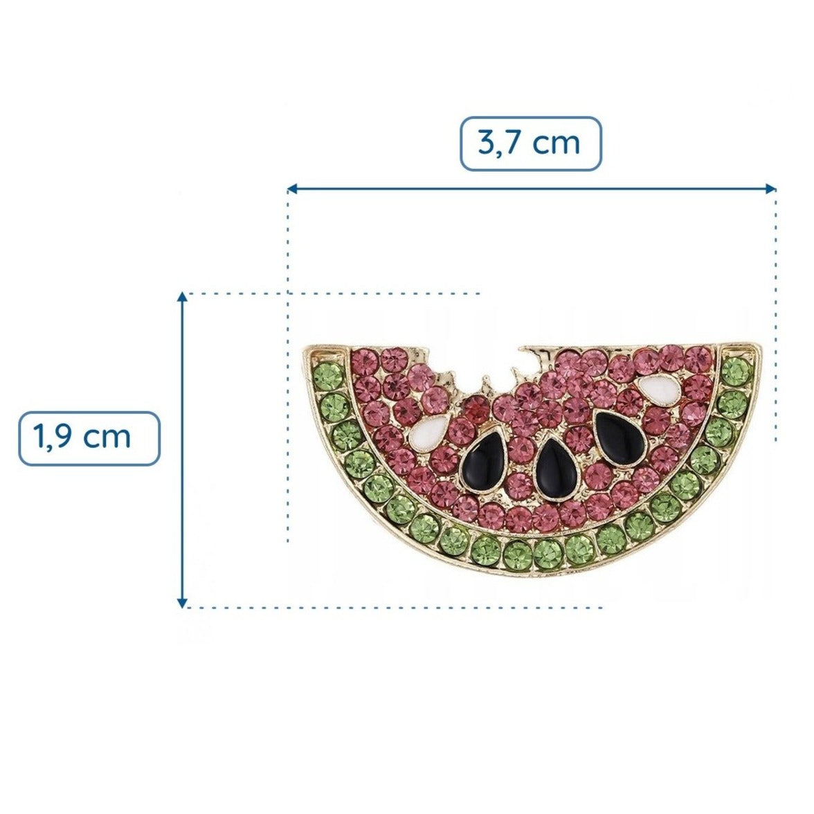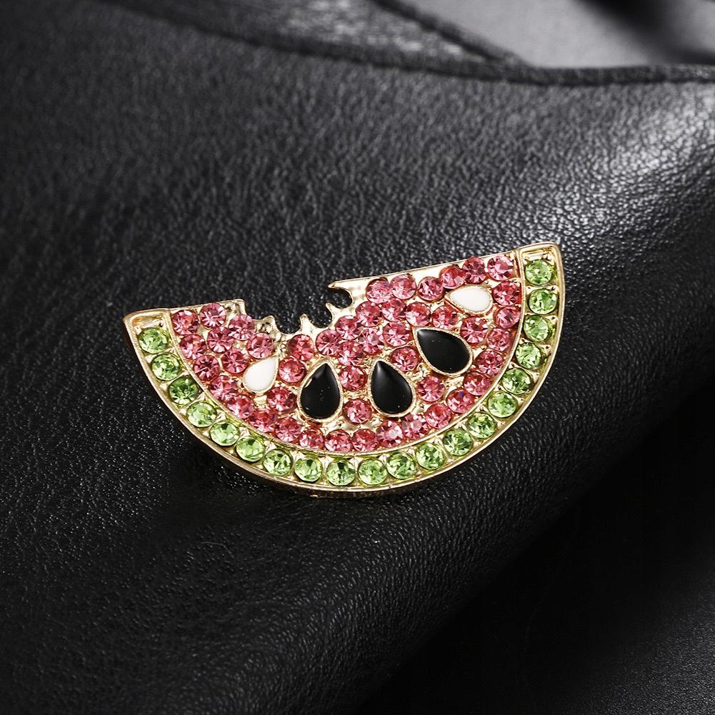 Broșa prezintă un motiv cu felii de pepene verde, împodobit cu zirconii, cu semințe albe și negre expuse și contururi aurii.