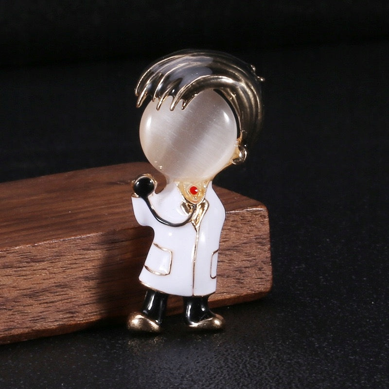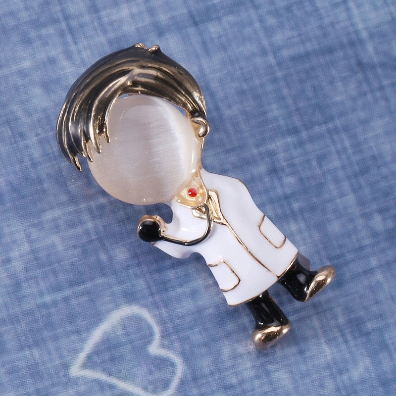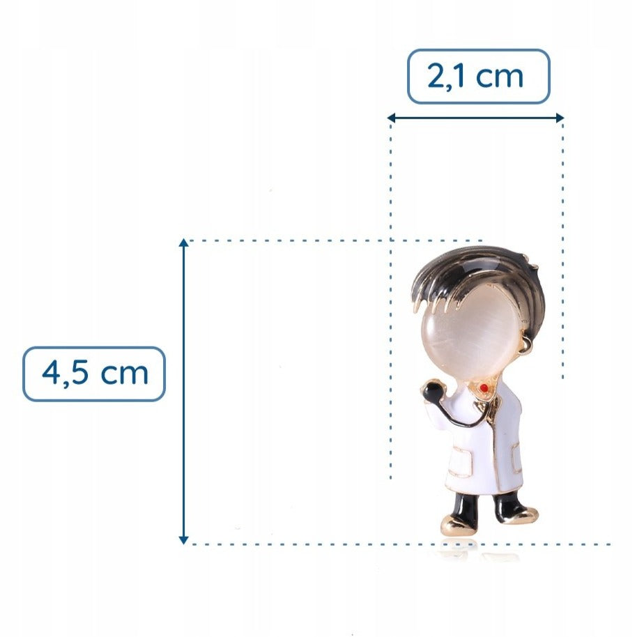 O broșă decorativă cu un doctor cu un stetoscop. Are o încuietoare tip ac de siguranță care se atașează ușor la orice articol vestimentar sau accesoriu. Acul menține bijuteria la locul ei în permanență, așa că nu trebuie să vă faceți griji că o veți desprinde accidental și o veți pierde.