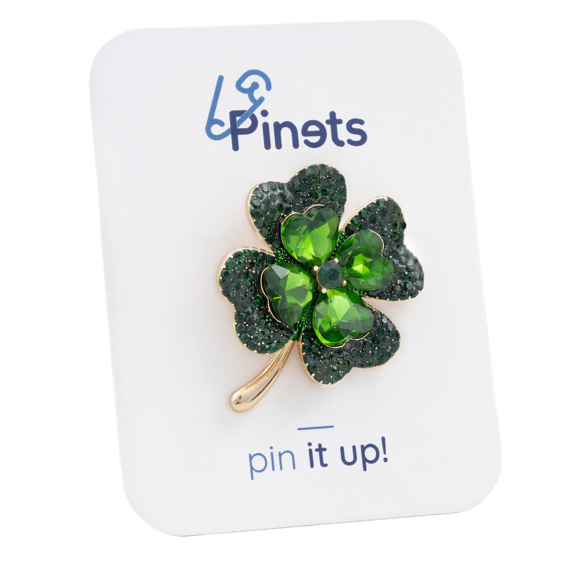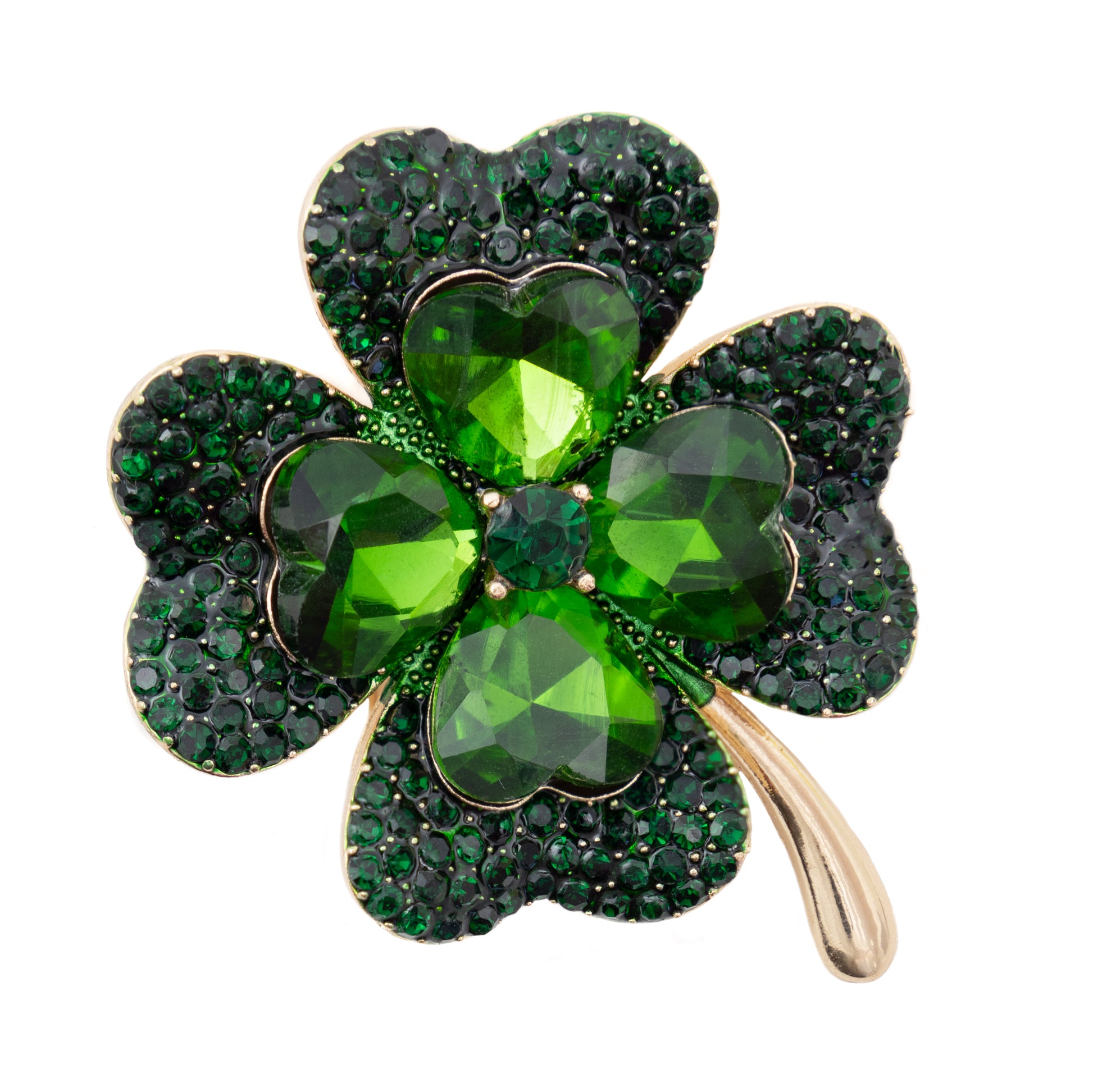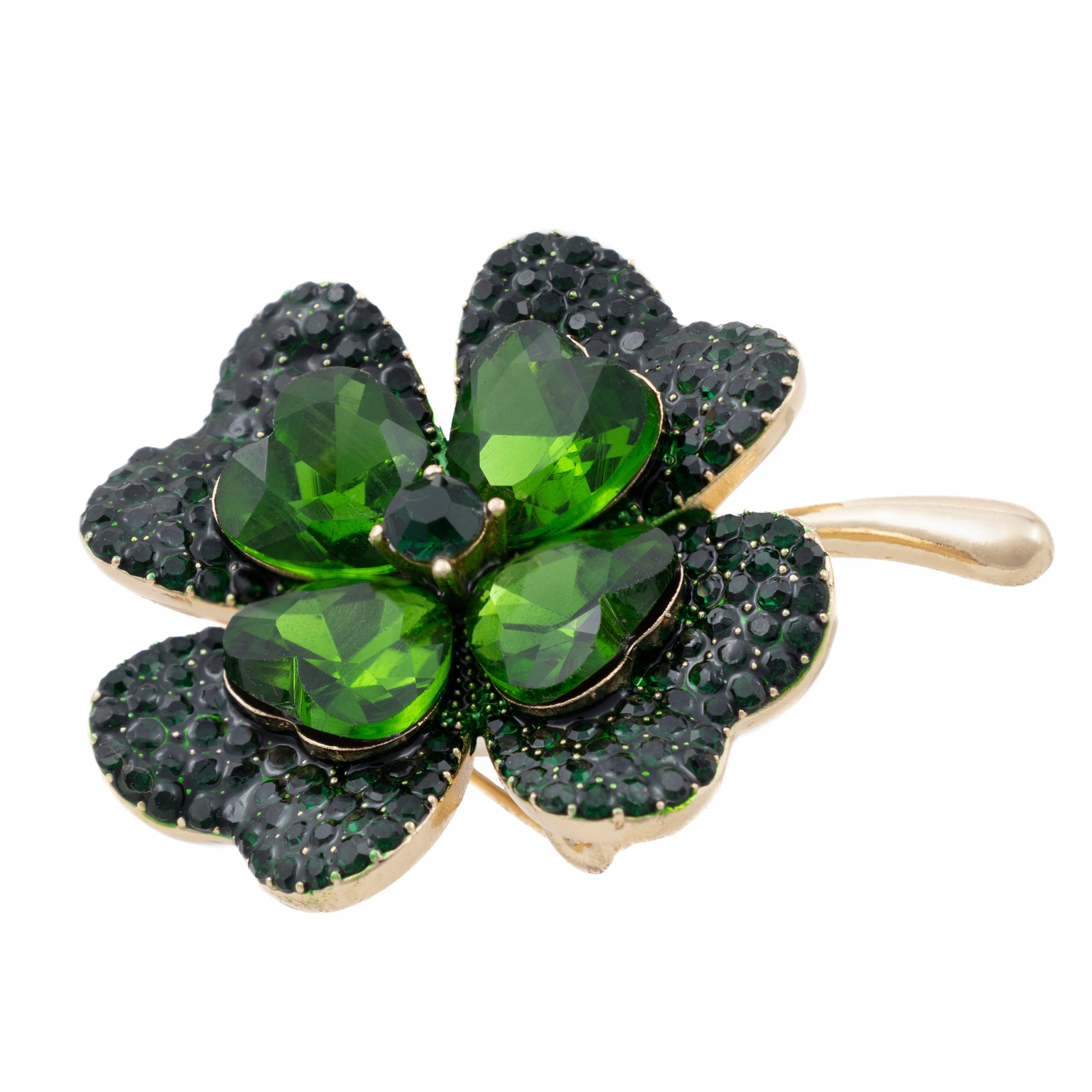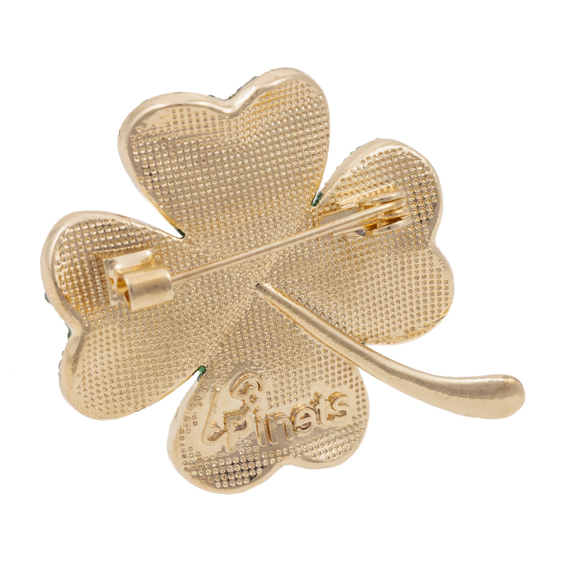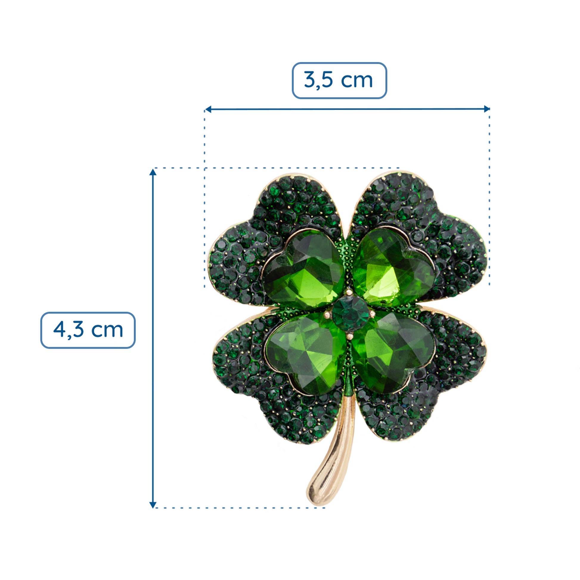 Această broșă decorativă prezintă un motiv de trifoi cu patru foi, decorat cu zirconii verzi. Închiderea cu ac de siguranță o face ușor de atașat la orice articol vestimentar sau accesoriu. Funcționează perfect atunci când este atașată la o jachetă, hanorac, geantă sau eșarfă.