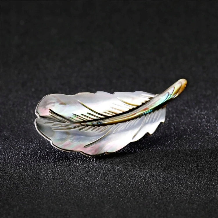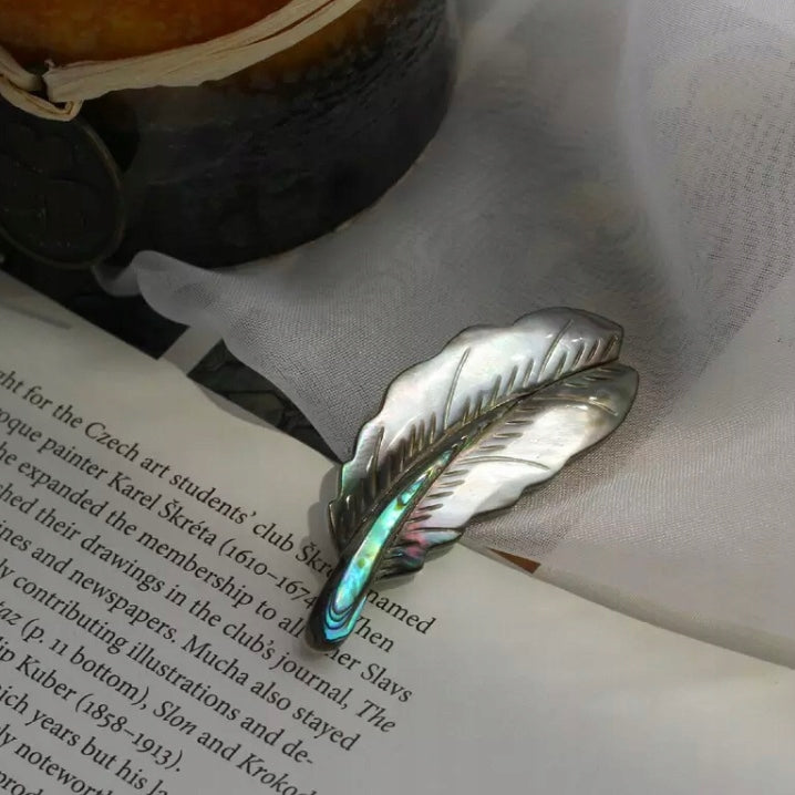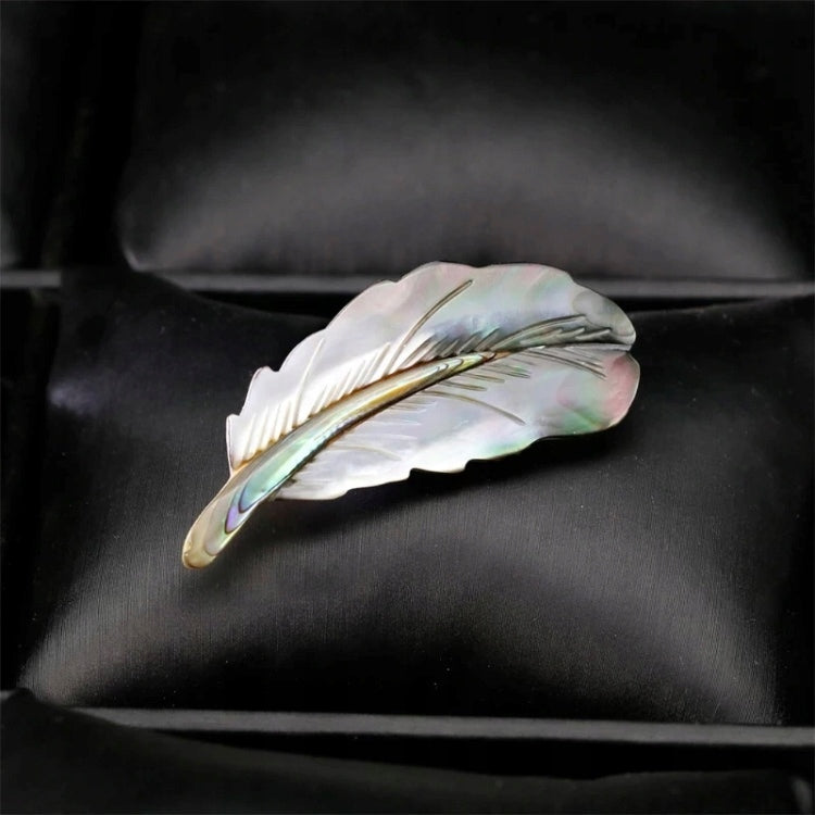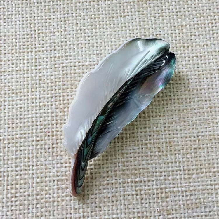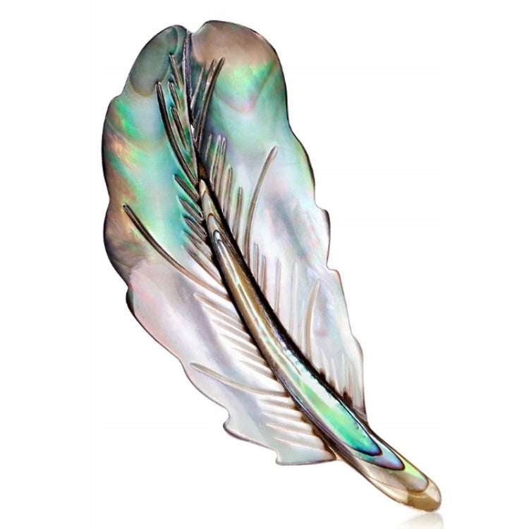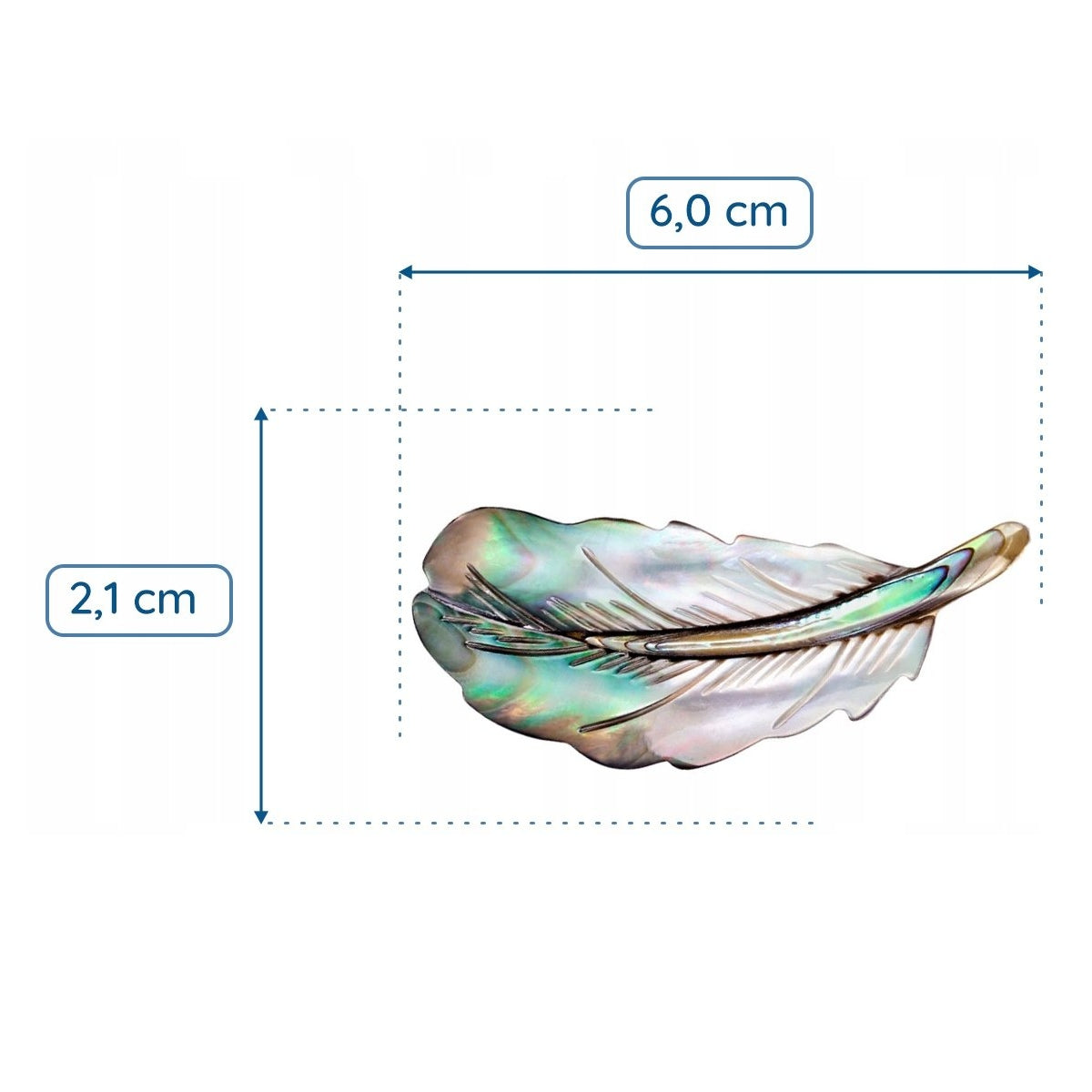Această broșă decorativă prezintă un motiv cu pene de pasăre și sidef. Are o încuietoare cu ac de siguranță care se atașează ușor la orice articol vestimentar sau accesoriu.