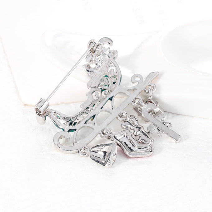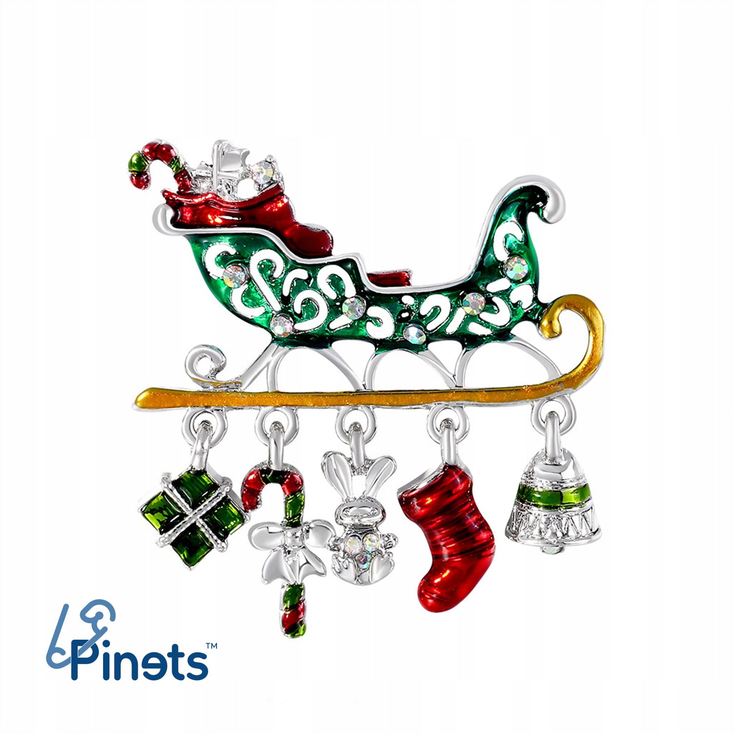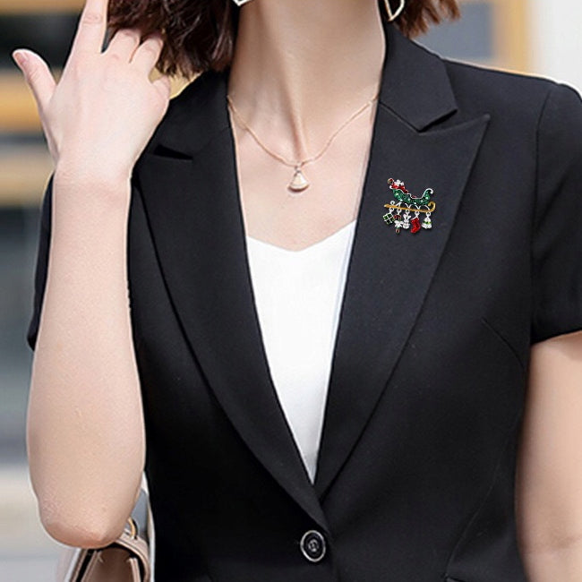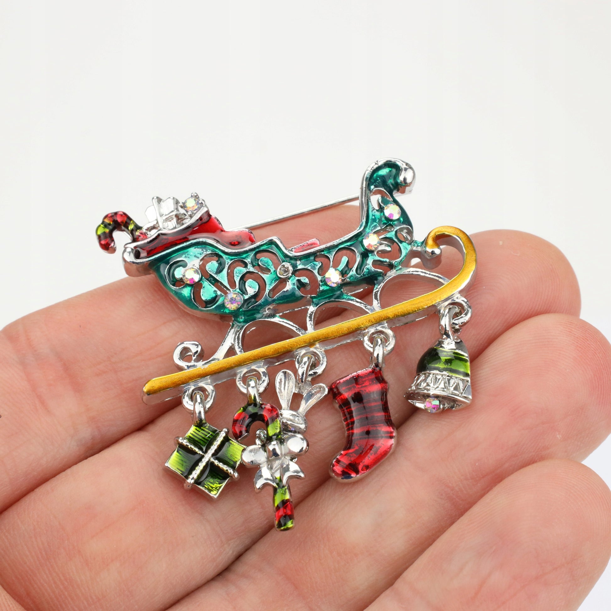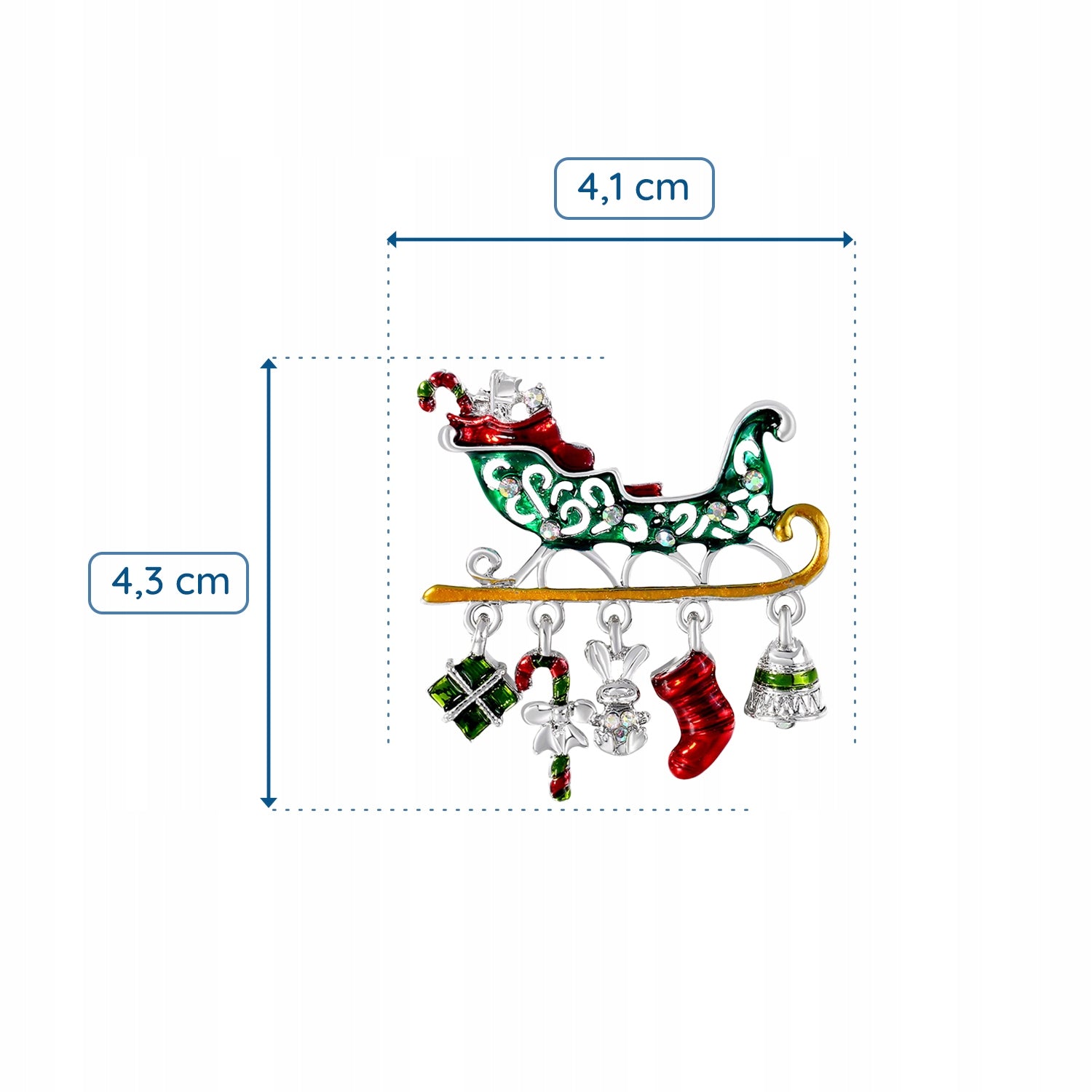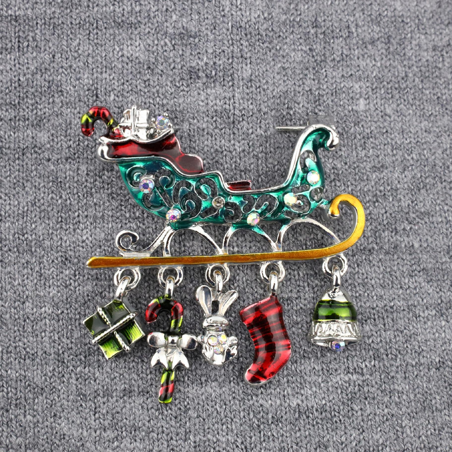 O broșă decorativă în formă de sanie trasă de Moș Crăciun, cu elemente mobile atașate de covoraș: o șosetă, un clopoțel, un iepuraș, un cadou și un baston. Prezintă o încuietoare tip ac de siguranță care se atașează ușor la orice articol vestimentar sau accesoriu. Acul menține ornamentul la locul lui în permanență, așa că nu trebuie să vă faceți griji că îl veți desprinde sau pierde accidental. Un plus unic pentru ținuta dvs. de Crăciun. Cadoul perfect pentru sub brad.