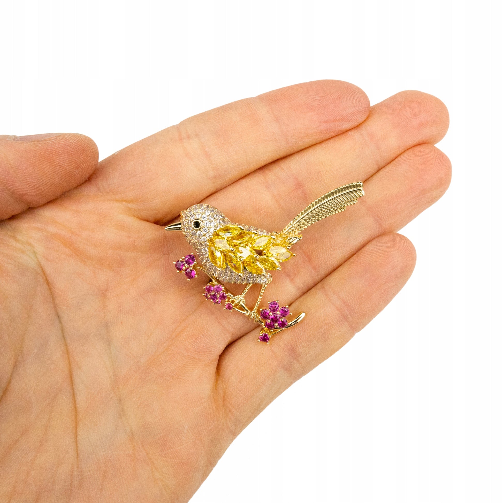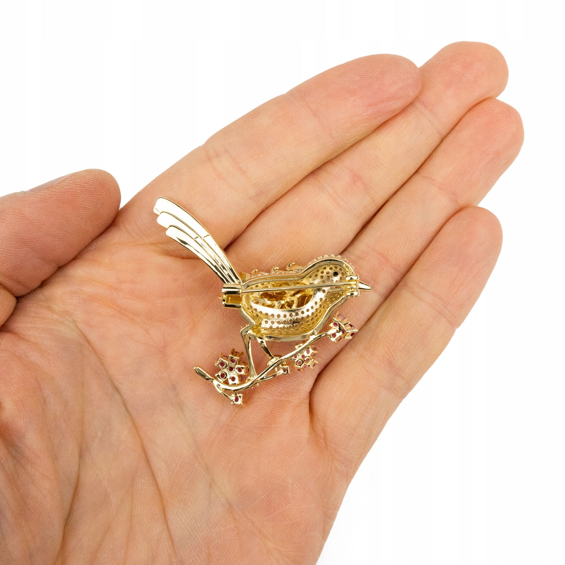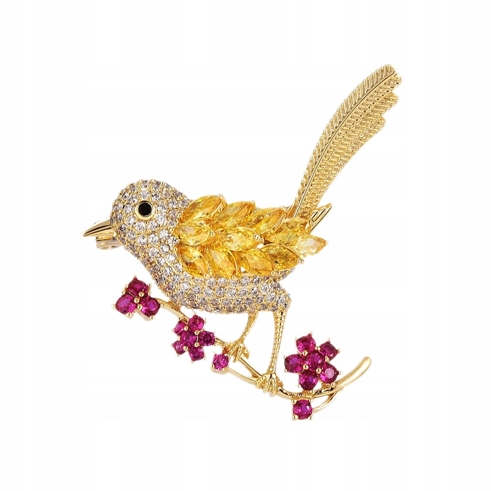 Pasăre pe o creangă cu flori - broșă placată cu aur de 14K