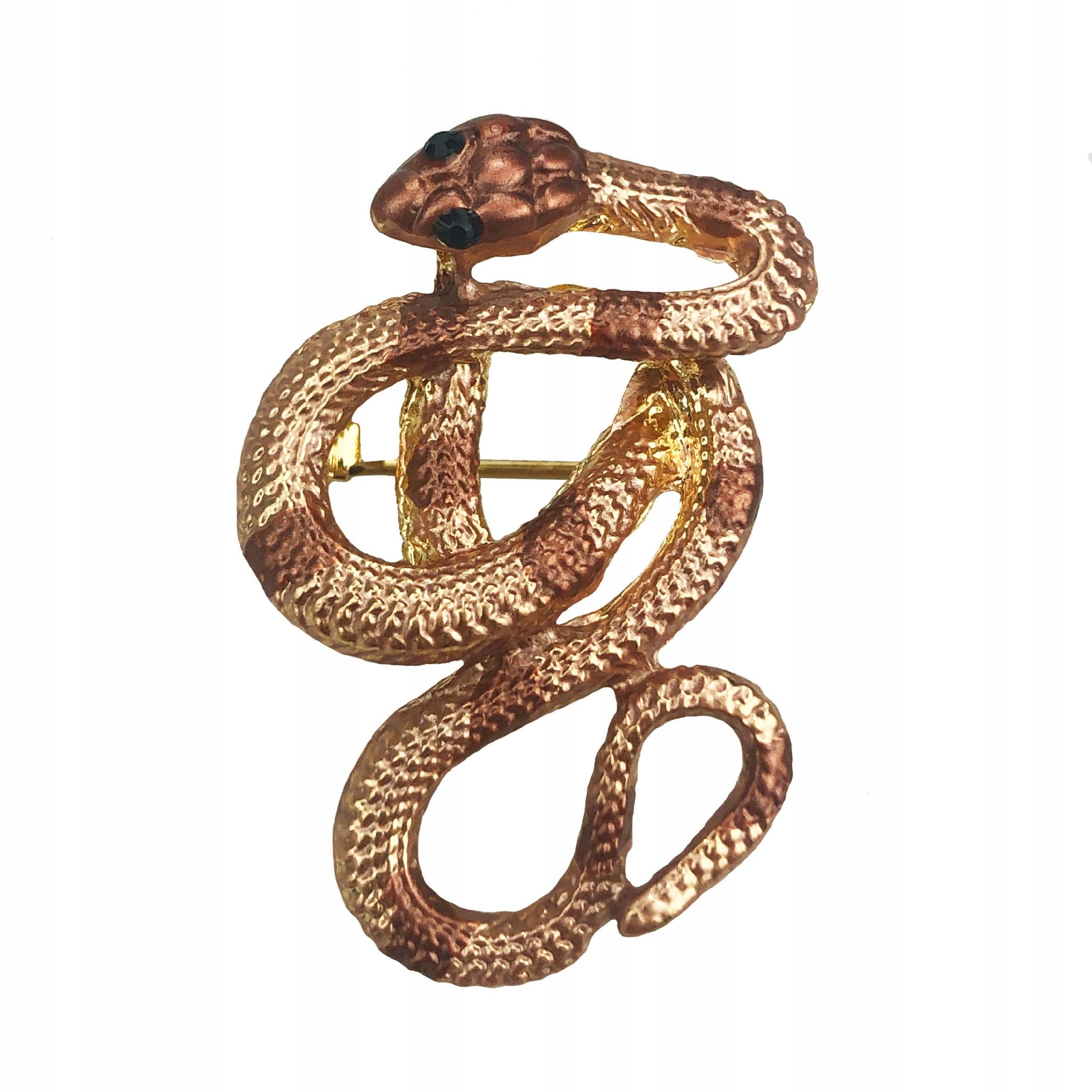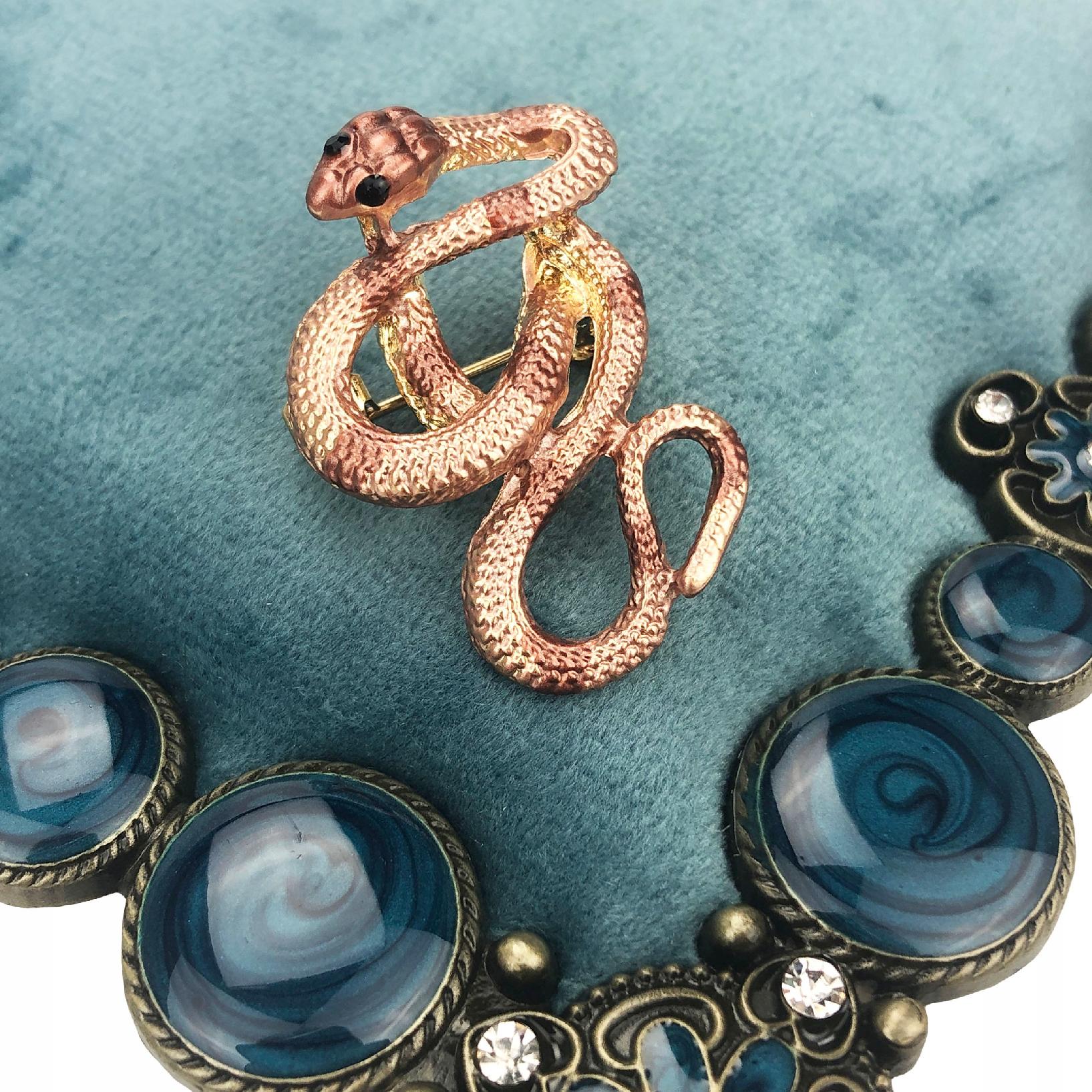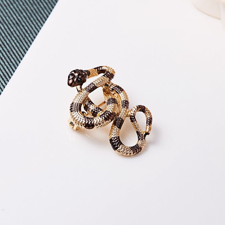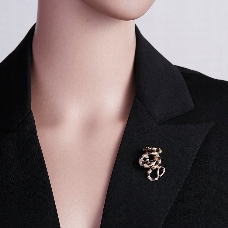 O broșă decorativă din aur în formă de șarpe auriu-maroniu, împodobită cu zirconiu cubic. Prezintă o încuietoare tip ac de siguranță care se atașează ușor la orice articol vestimentar sau accesoriu. Acul fixează bijuteria în siguranță, așa că nu trebuie să vă faceți griji că o veți desprinde accidental și o veți pierde. Un cadou perfect pentru un pasionat de terarii.