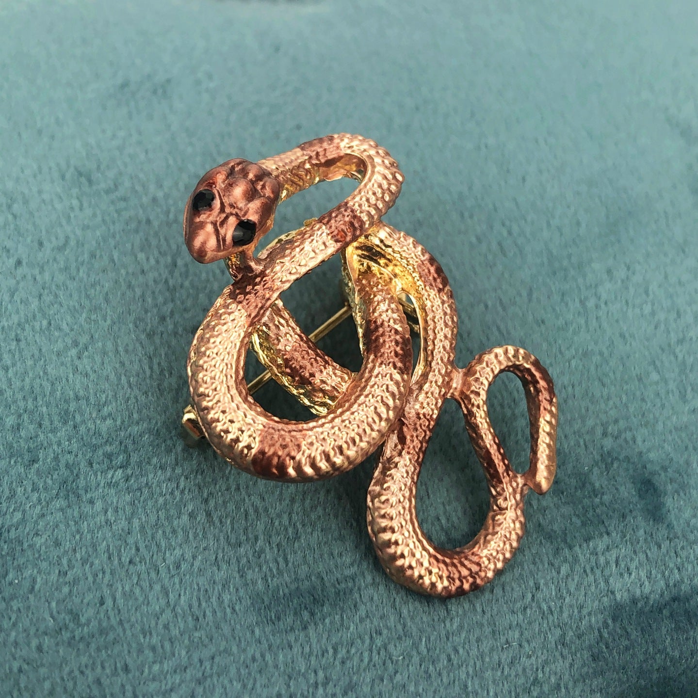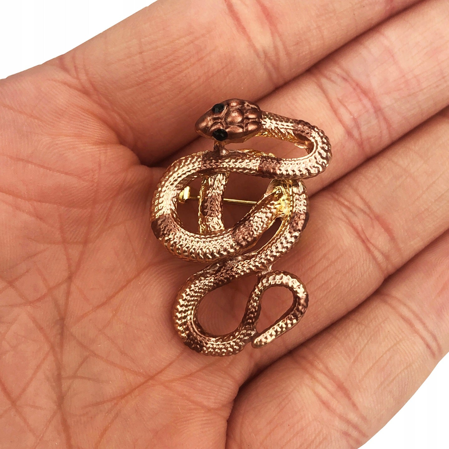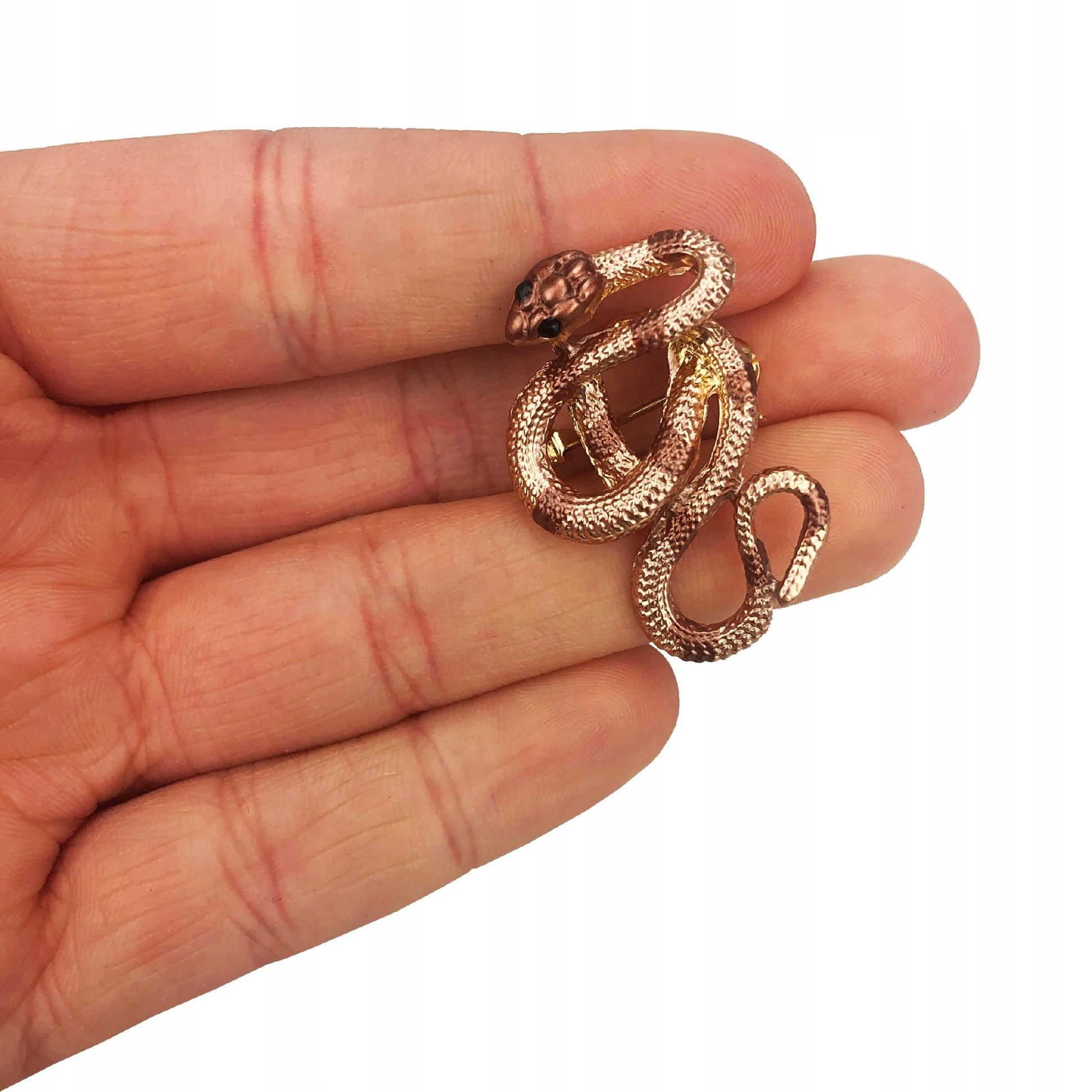 O broșă decorativă din aur în formă de șarpe auriu-maroniu, împodobită cu zirconiu cubic. Prezintă o încuietoare tip ac de siguranță care se atașează ușor la orice articol vestimentar sau accesoriu. Acul fixează bijuteria în siguranță, așa că nu trebuie să vă faceți griji că o veți desprinde accidental și o veți pierde. Un cadou perfect pentru un pasionat de terarii.
