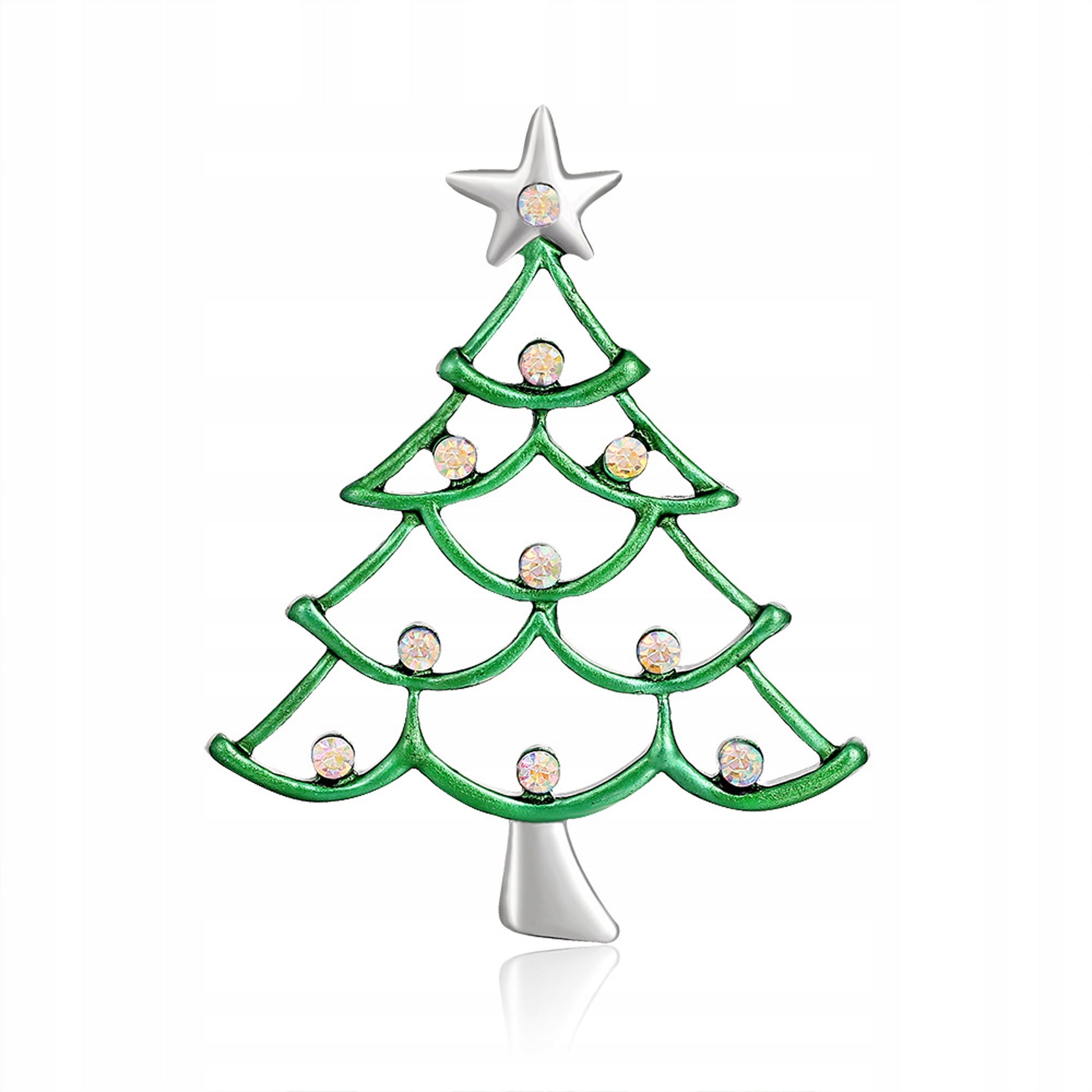 O broșă decorativă cu motiv de brad de Crăciun și stea, împodobită cu zirconiu cubic. Prezintă o încuietoare tip ac de siguranță care se atașează ușor la orice articol vestimentar sau accesoriu. Acul de siguranță menține broșa la locul ei în permanență, așa că nu trebuie să vă faceți griji că bijuteriile se vor desprinde accidental sau se vor pierde. O modalitate perfectă de a vă da un plus de savoare ținutei de Crăciun.