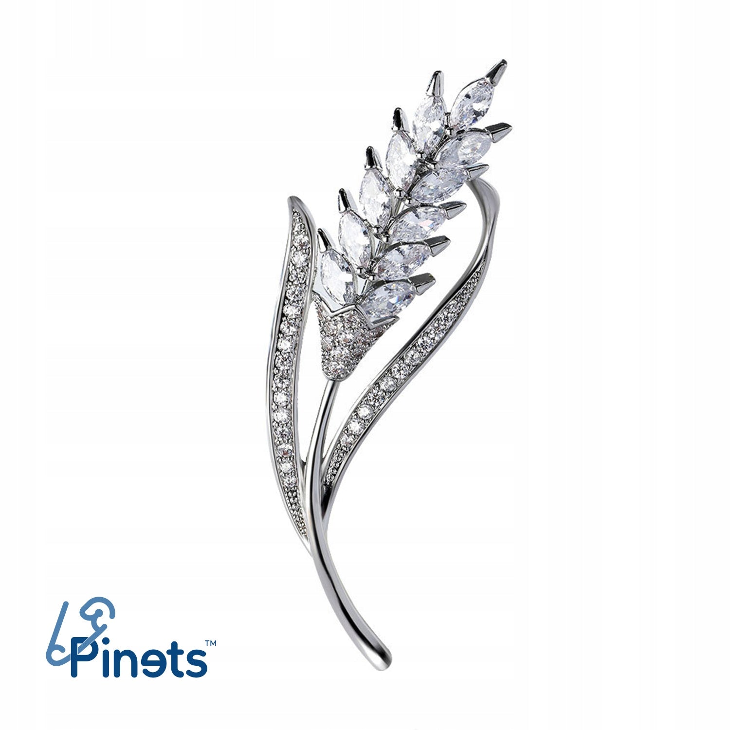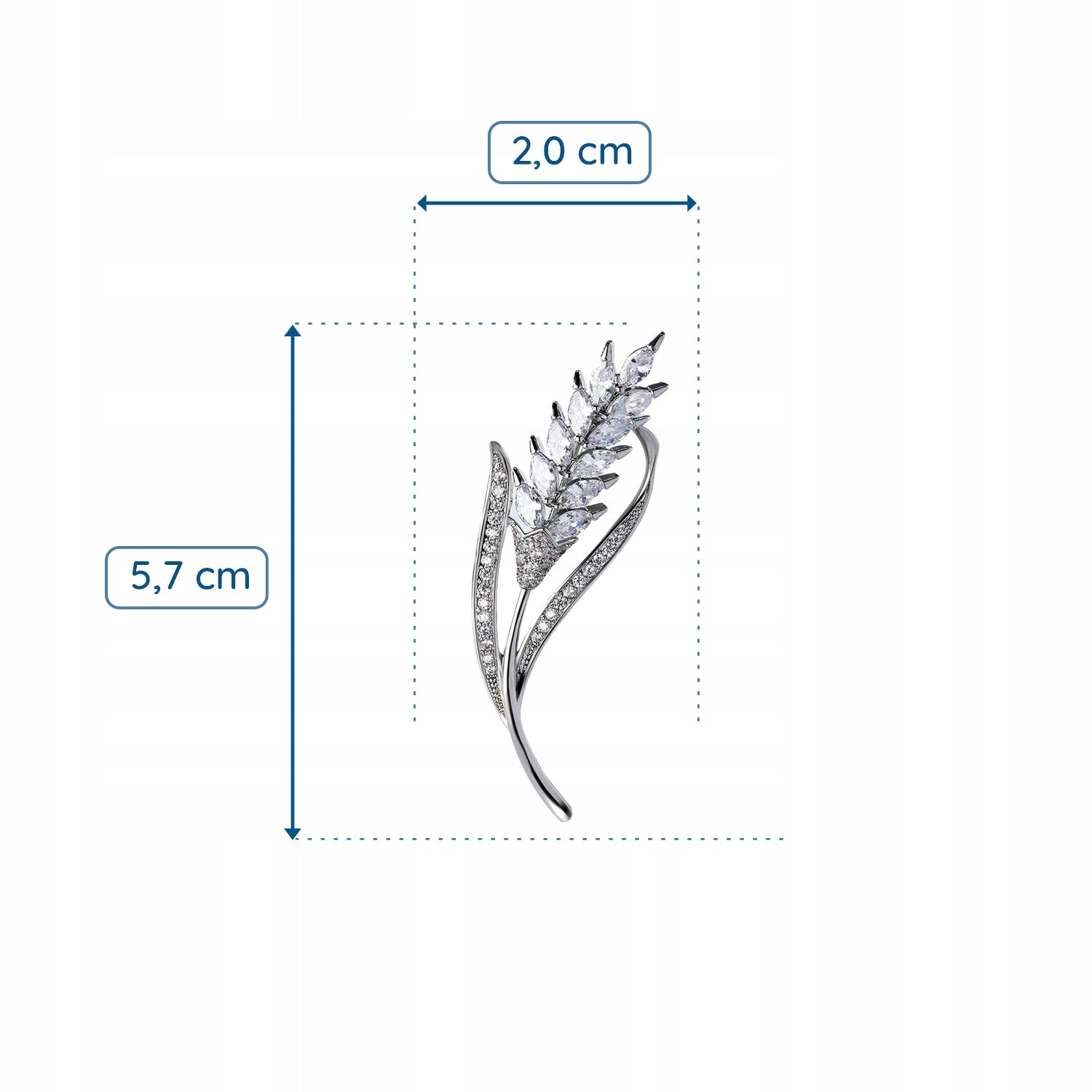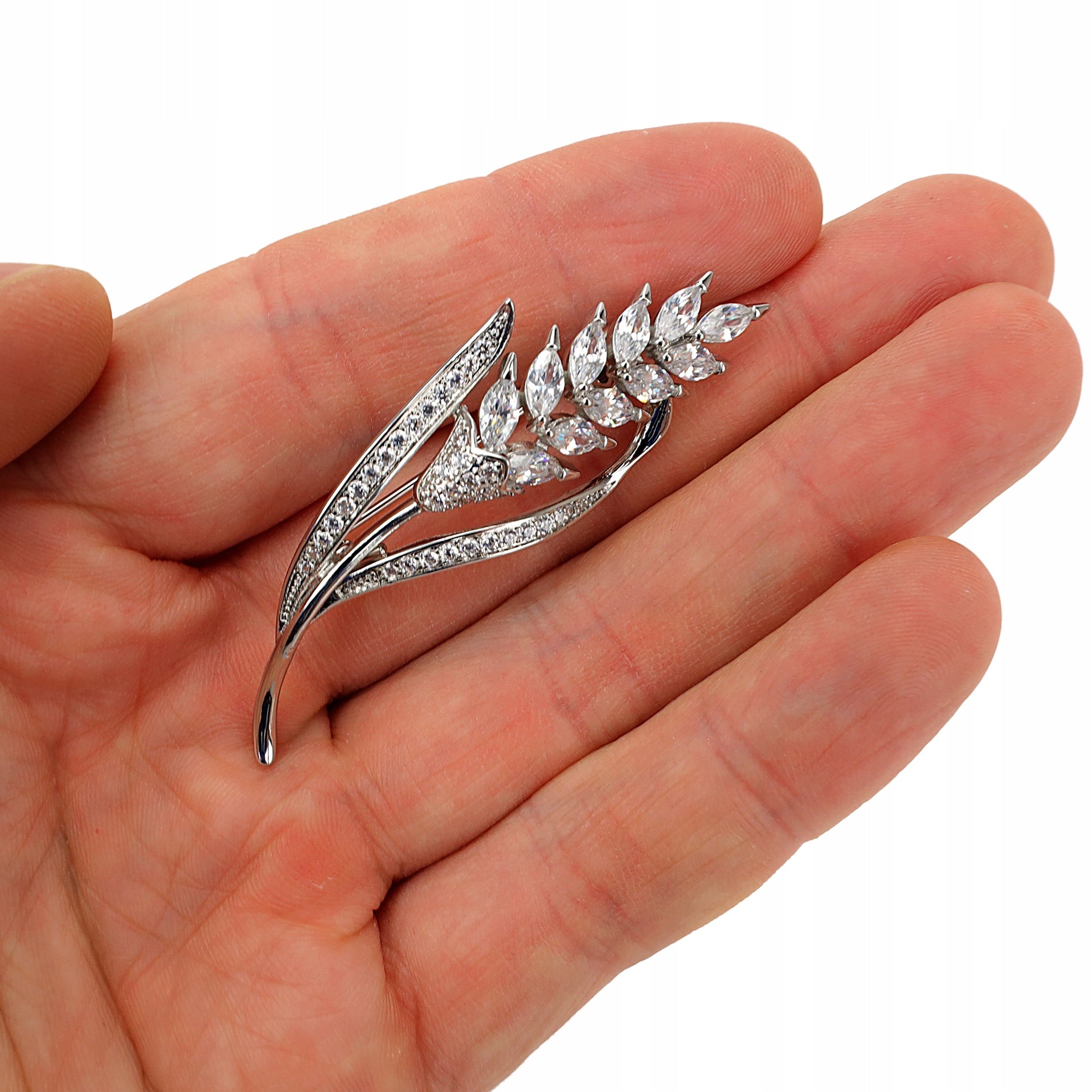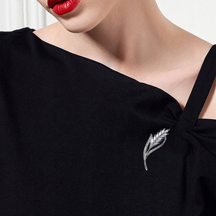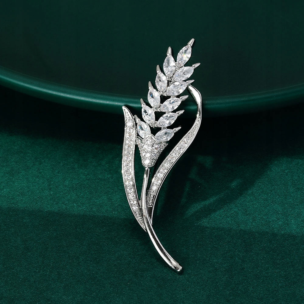 O broșă decorativă cu motiv de spice de grâu, placată cu aur alb de 14K și decorată cu zirconiu cubic. Prezintă o încuietoare tip ac de siguranță care se atașează ușor la orice articol vestimentar sau accesoriu. Acul menține piesa la locul ei în permanență, așa că nu trebuie să vă faceți griji că se va desprinde accidental și va fi pierdută. Cadoul perfect pentru orice femeie.