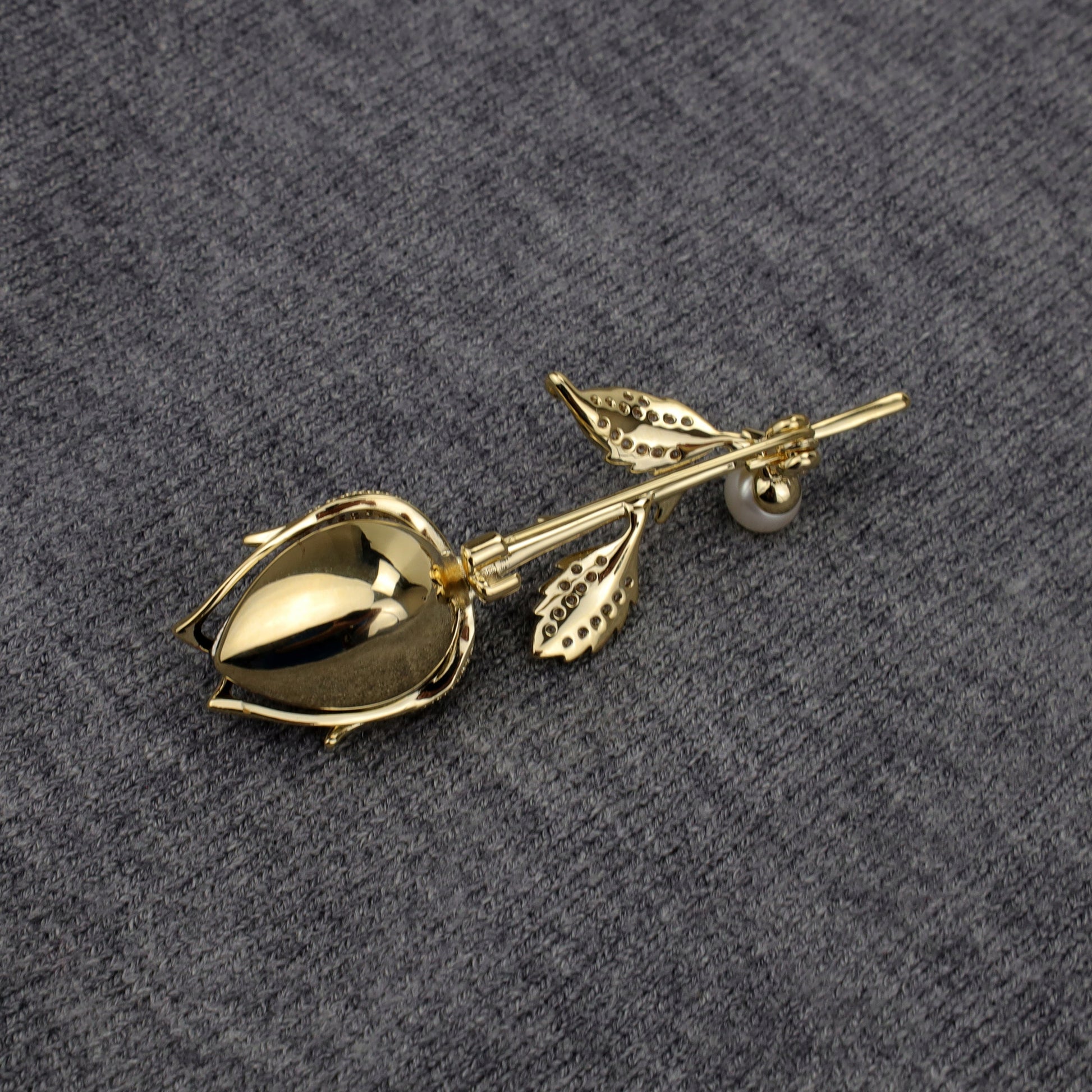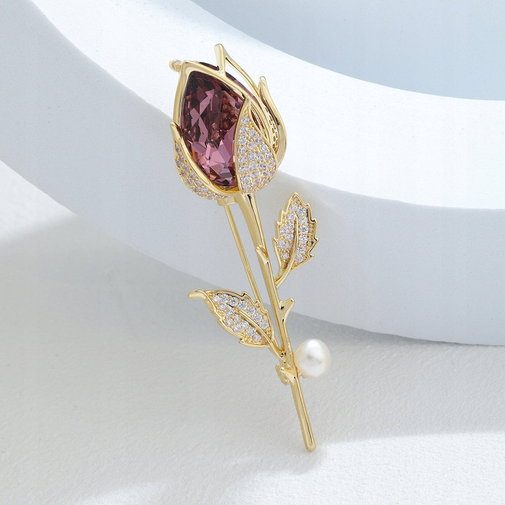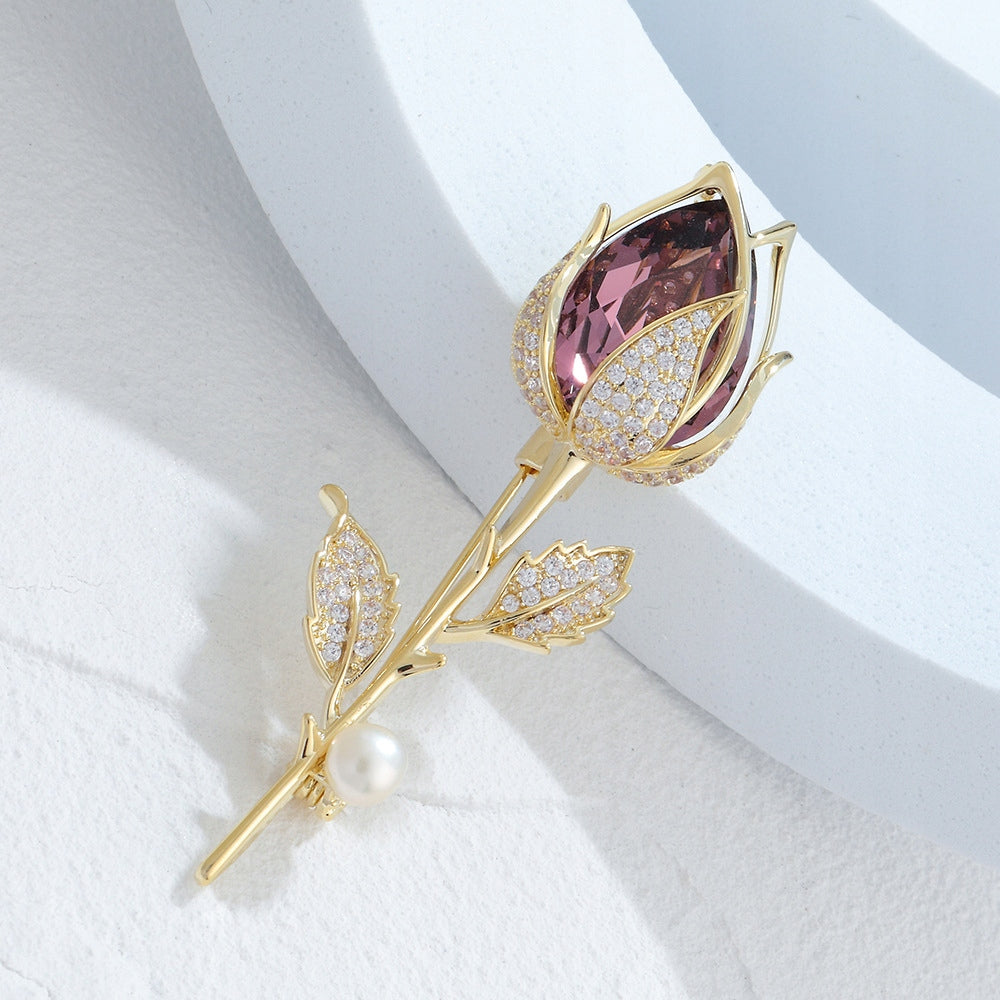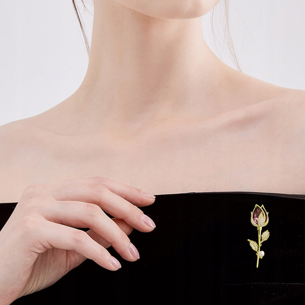 Broșă placată cu aur de 14K - Trandafir cu zirconii și o perlă