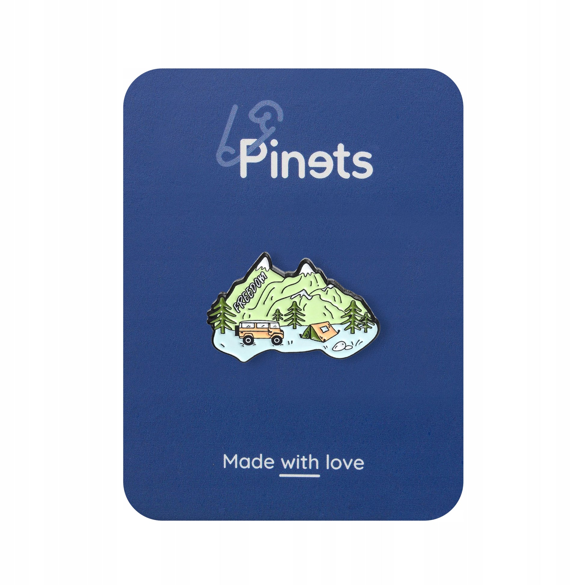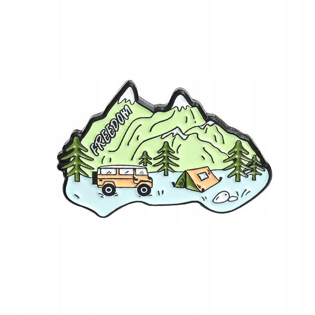 Această broșă decorativă emailată prezintă o priveliște montană cu o rulotă, un cort și cuvântul „Libertate”. Prezintă un ac metalic, permițând atașarea și îndepărtarea ușoară a acesteia la orice tip de îmbrăcăminte fără a deteriora materialul. Un cadou unic pentru orice pasionat de drumeții montane.