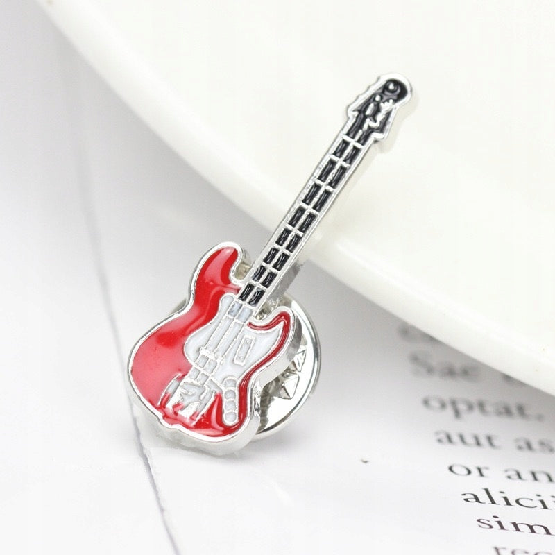 Această broșă decorativă emailată prezintă un motiv de chitară roșie și albă. Prezintă o broșă metalică, permițând atașarea și îndepărtarea ușoară a oricărei ținute fără a deteriora materialul. Această broșă în formă de chitară va adăuga o notă unică ținutei tale purtate la un concert rock.