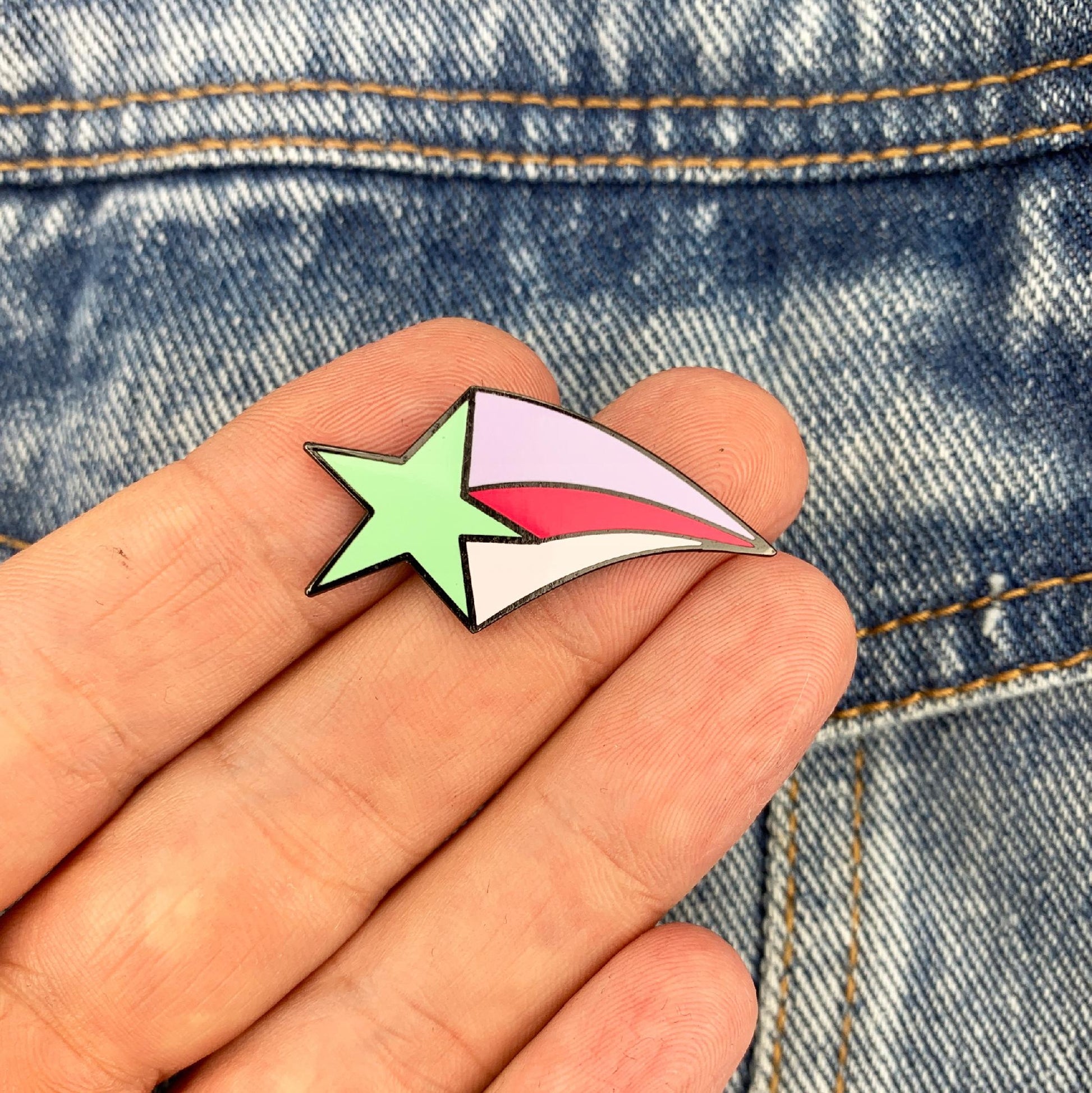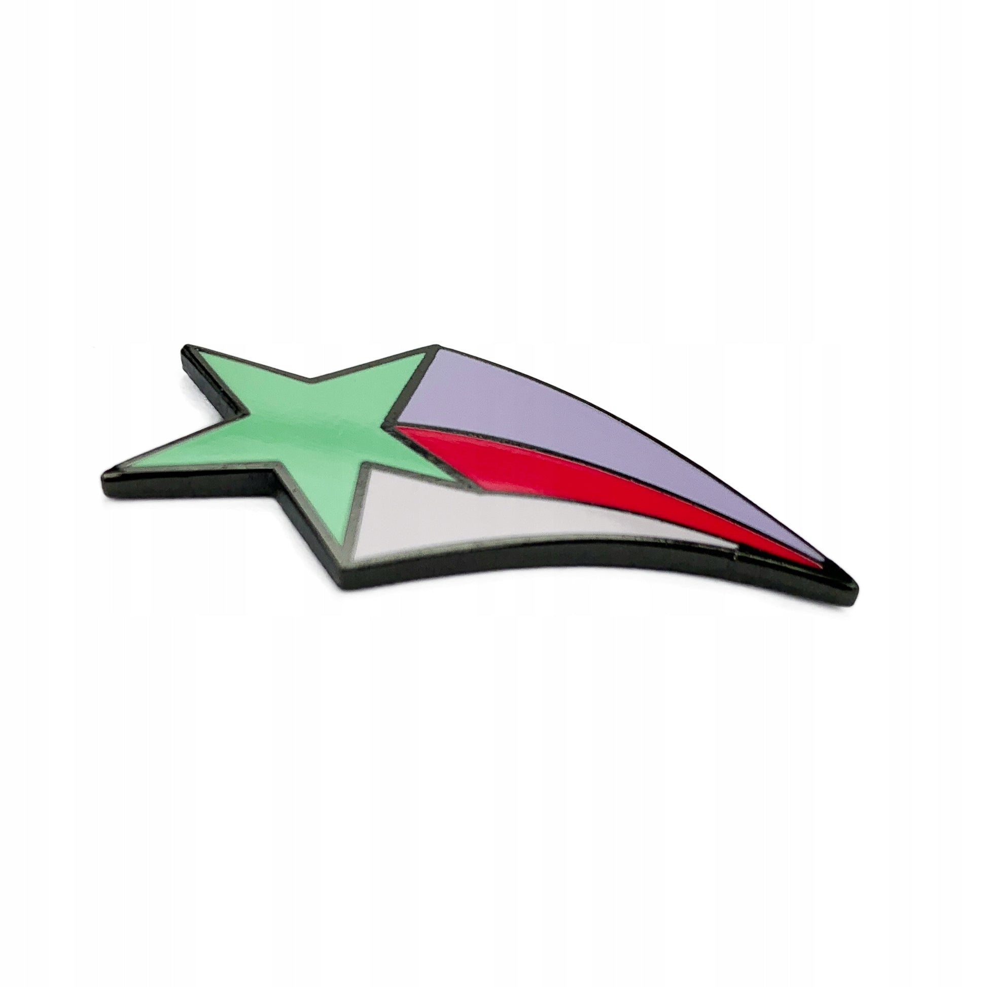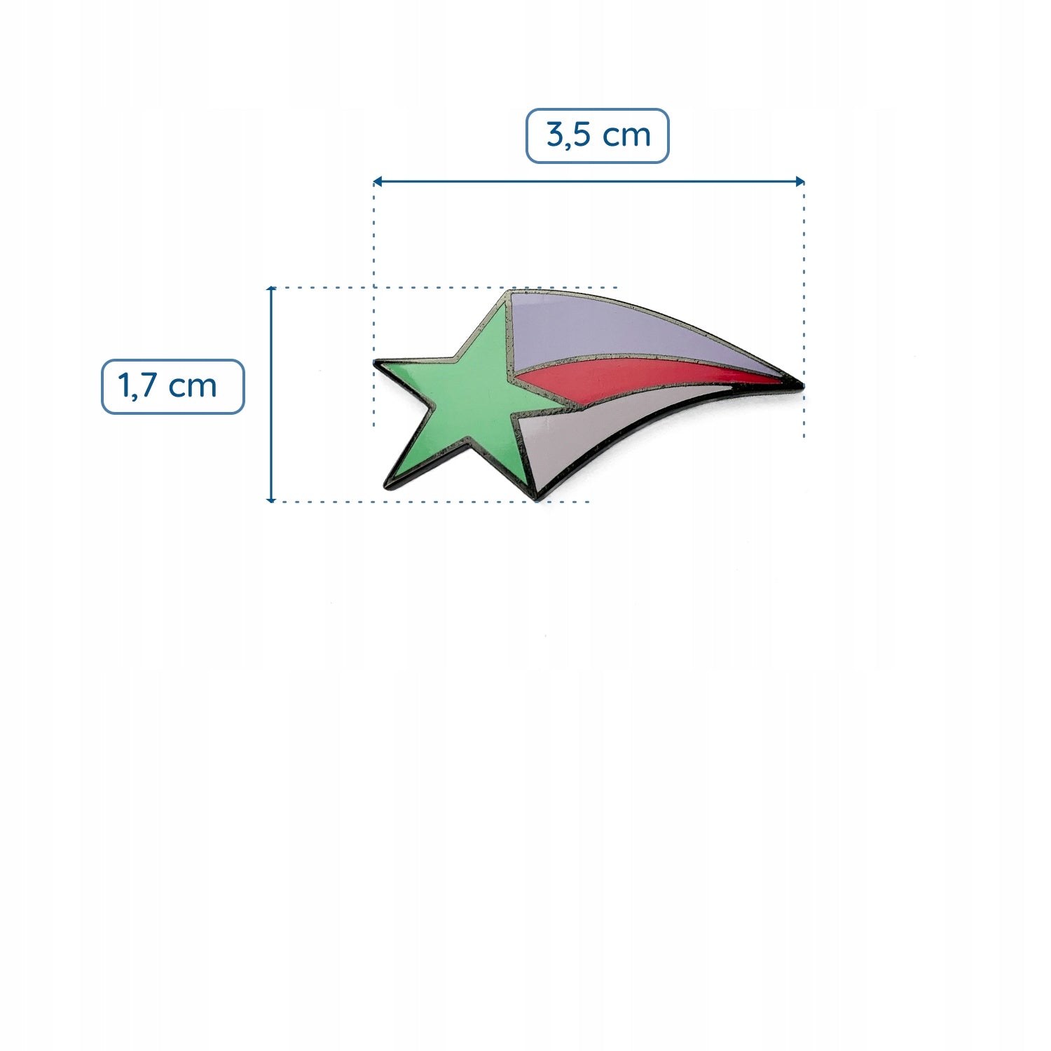 Această broșă decorativă din email prezintă un motiv cu o stea cosmică verde zburătoare. Prezintă o broșă metalică, sau o „clemă”, care permite atașarea și îndepărtarea ușoară a acesteia de orice tip de îmbrăcăminte fără a deteriora materialul. Un cadou fermecător pentru un pasionat de spațiu, astronomie sau un copil fascinat de stele.
