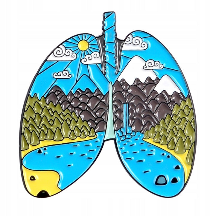 Această broșă decorativă din email prezintă un motiv cu plămâni și o vedere la munte. Prezintă o broșă metalică, sau o „clemă”, care permite atașarea și îndepărtarea ușoară a acesteia de orice tip de îmbrăcăminte fără a deteriora materialul. Un cadou minunat pentru un călător.
