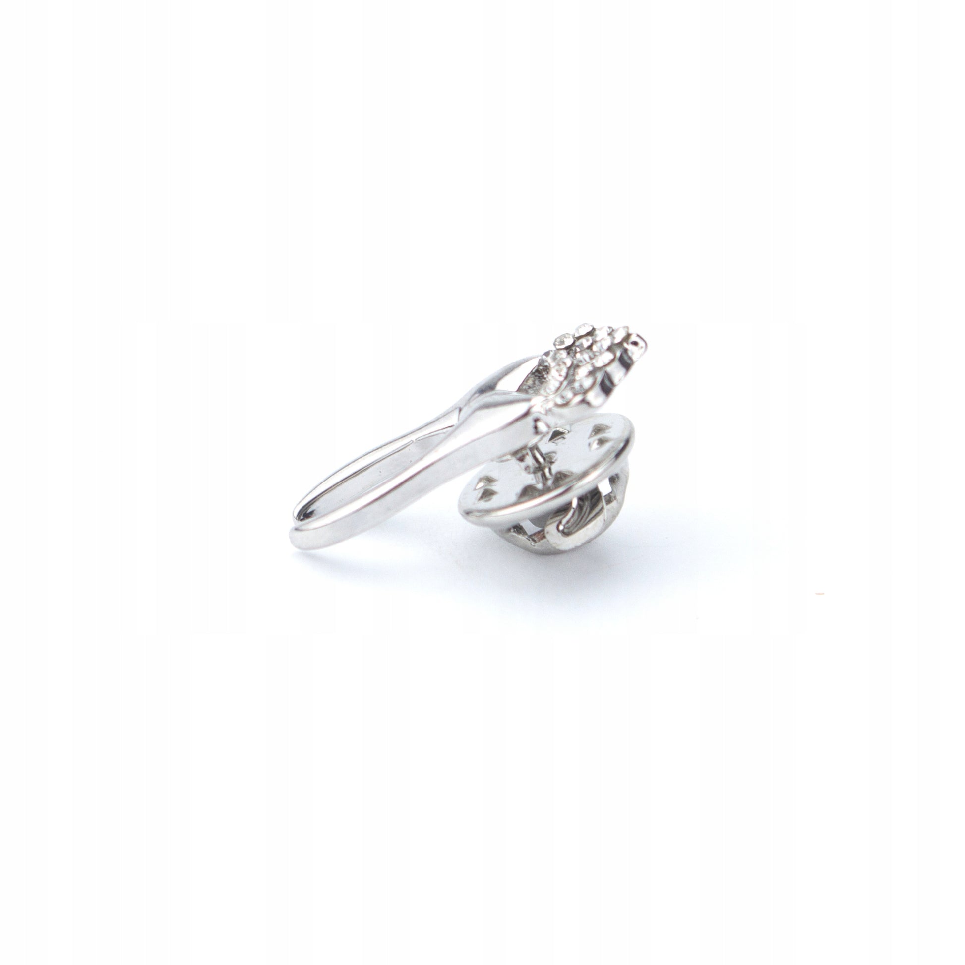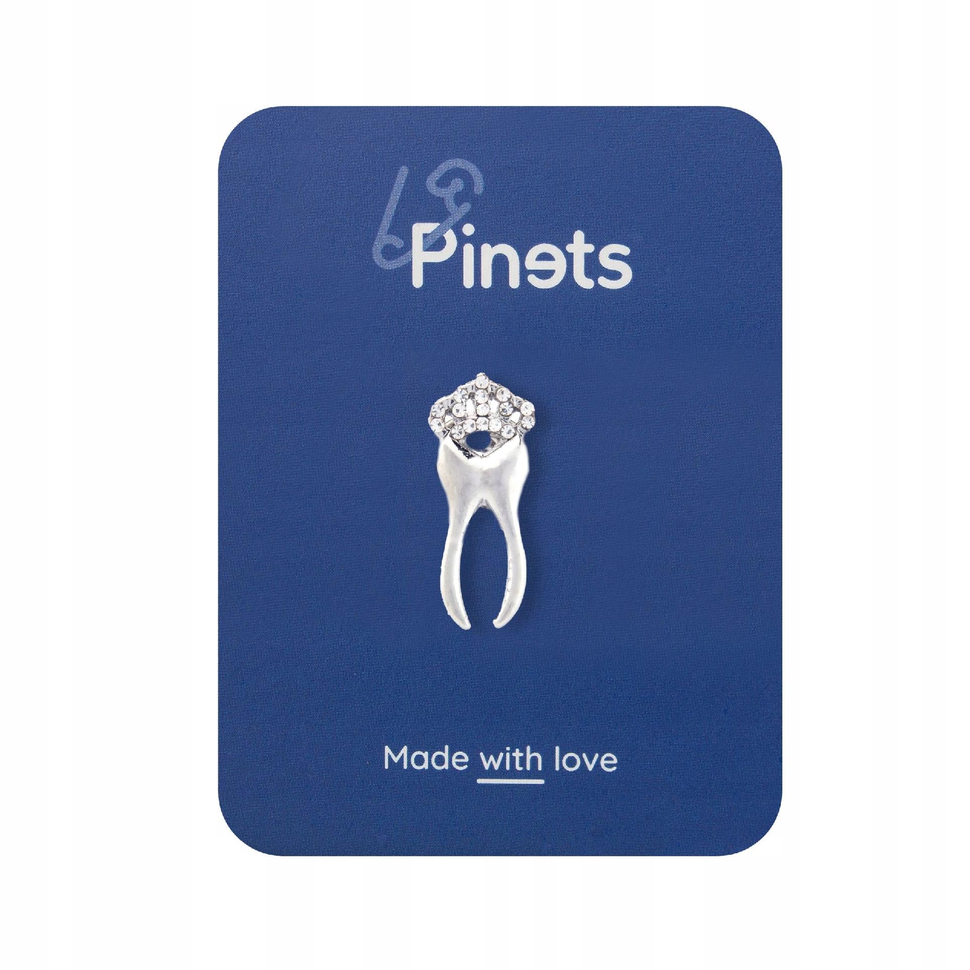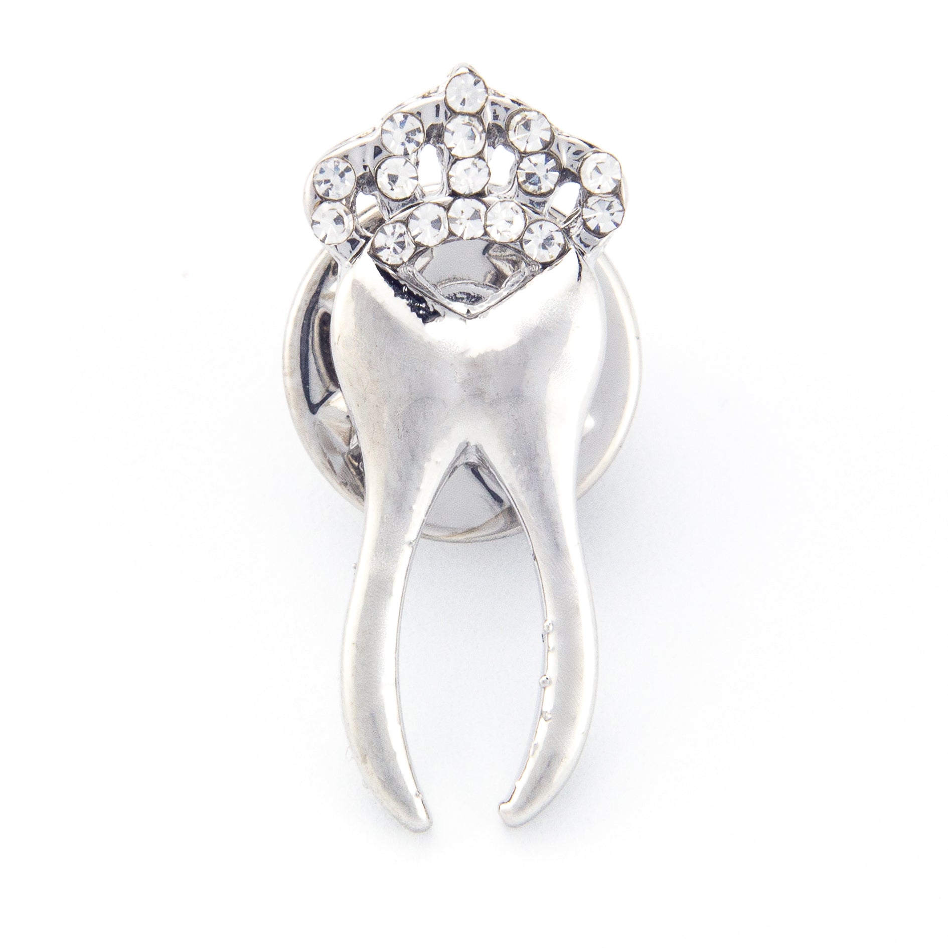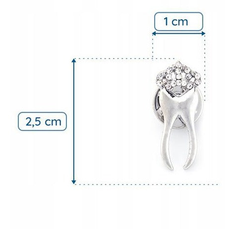 Această broșă decorativă emailată prezintă un dinte de argint într-un motiv de coroană. Prezintă o broșă metalică, sau o „clemă”, care permite atașarea ușoară la o jachetă, hanorac, geantă sau eșarfă fără a deteriora materialul.