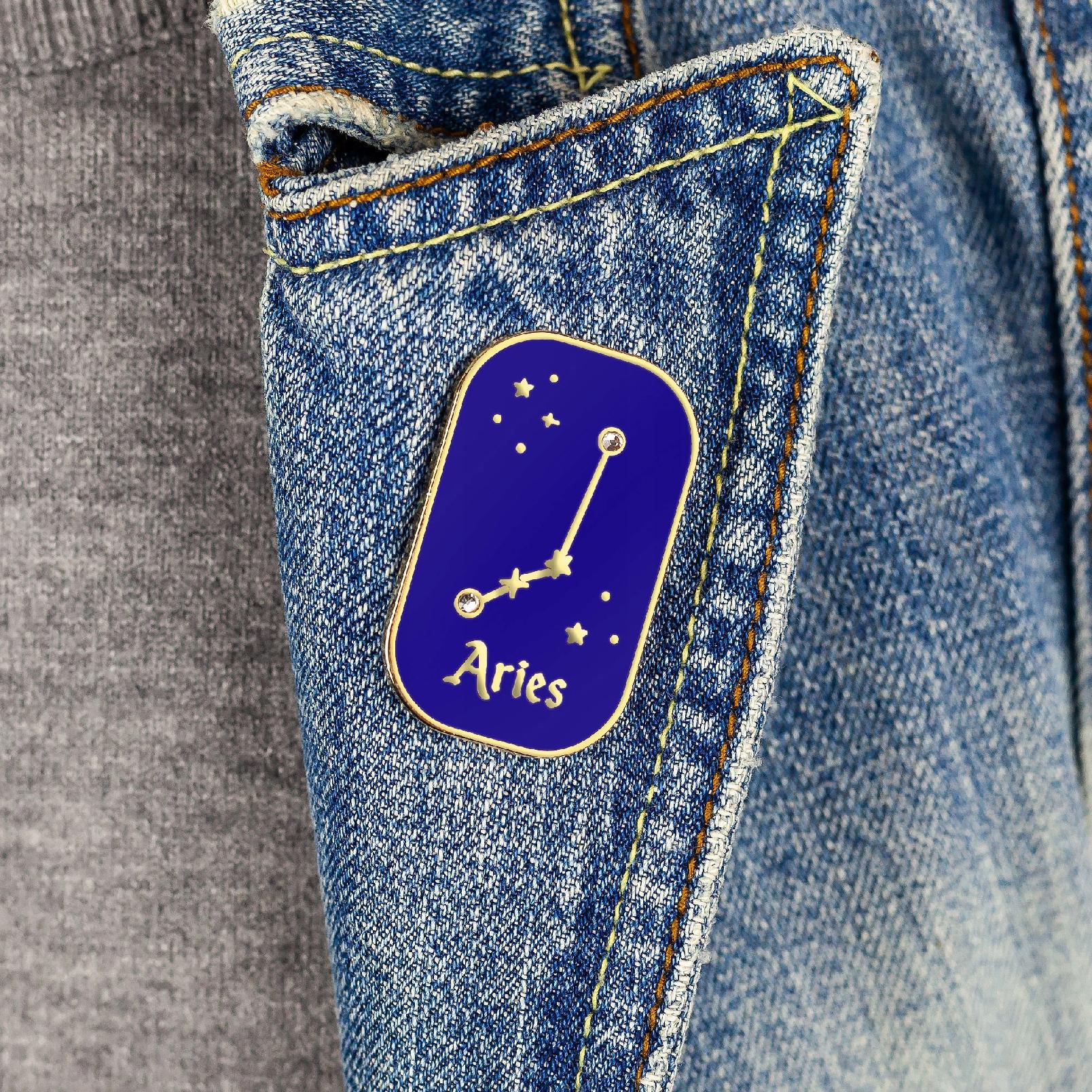 Această broșă decorativă prezintă constelația Berbecului, împodobită cu zirconiu cubic și finisată cu aur de 14 karate. Prezintă două broșe metalice, sau „ace”, care permit atașarea sau scoaterea ușoară a broșei de pe orice ținută, fără a deteriora materialul. Această broșă cu semn zodiacal este o idee originală de cadou de ziua de naștere.
