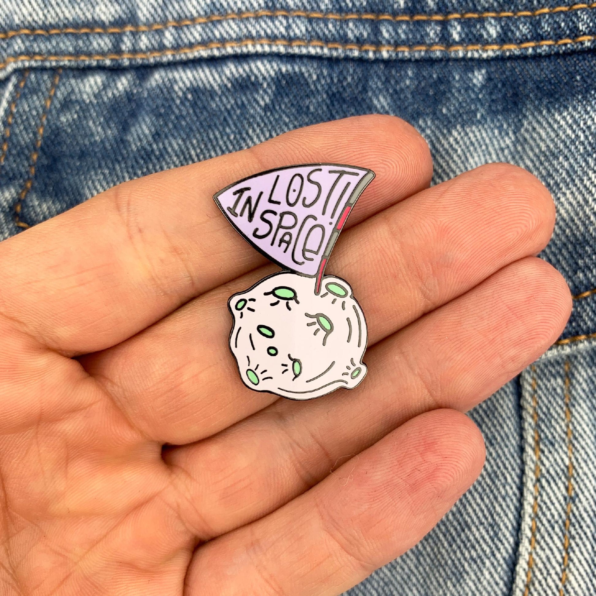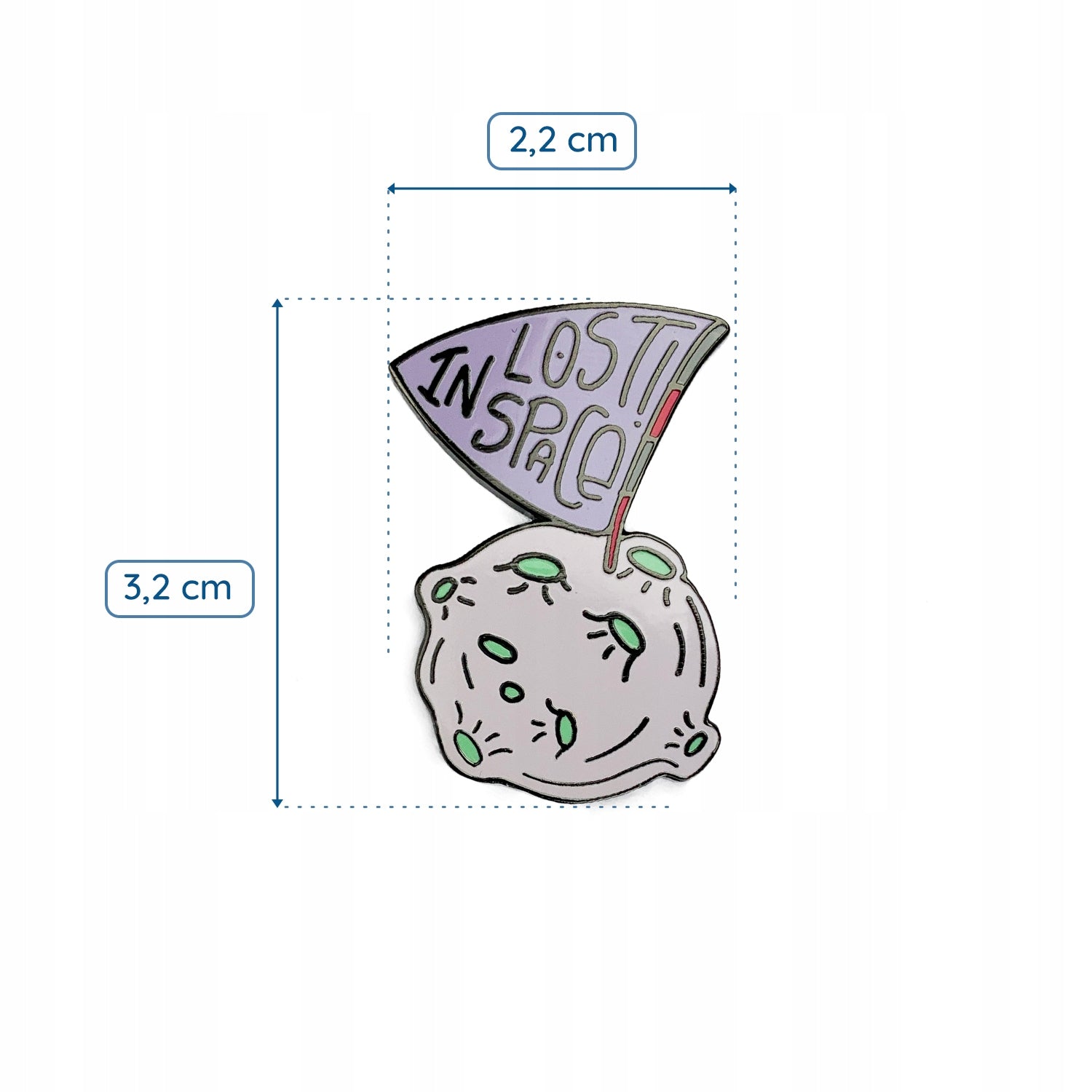 Această broșă decorativă din email prezintă un motiv de meteorit și inscripția „Pierdut în spațiu”. Prezintă o broșă metalică, permițând atașarea sau scoaterea ușoară de pe orice articol vestimentar fără a deteriora materialul. Un cadou original și unic pentru orice pasionat de spațiu sau astronomie.