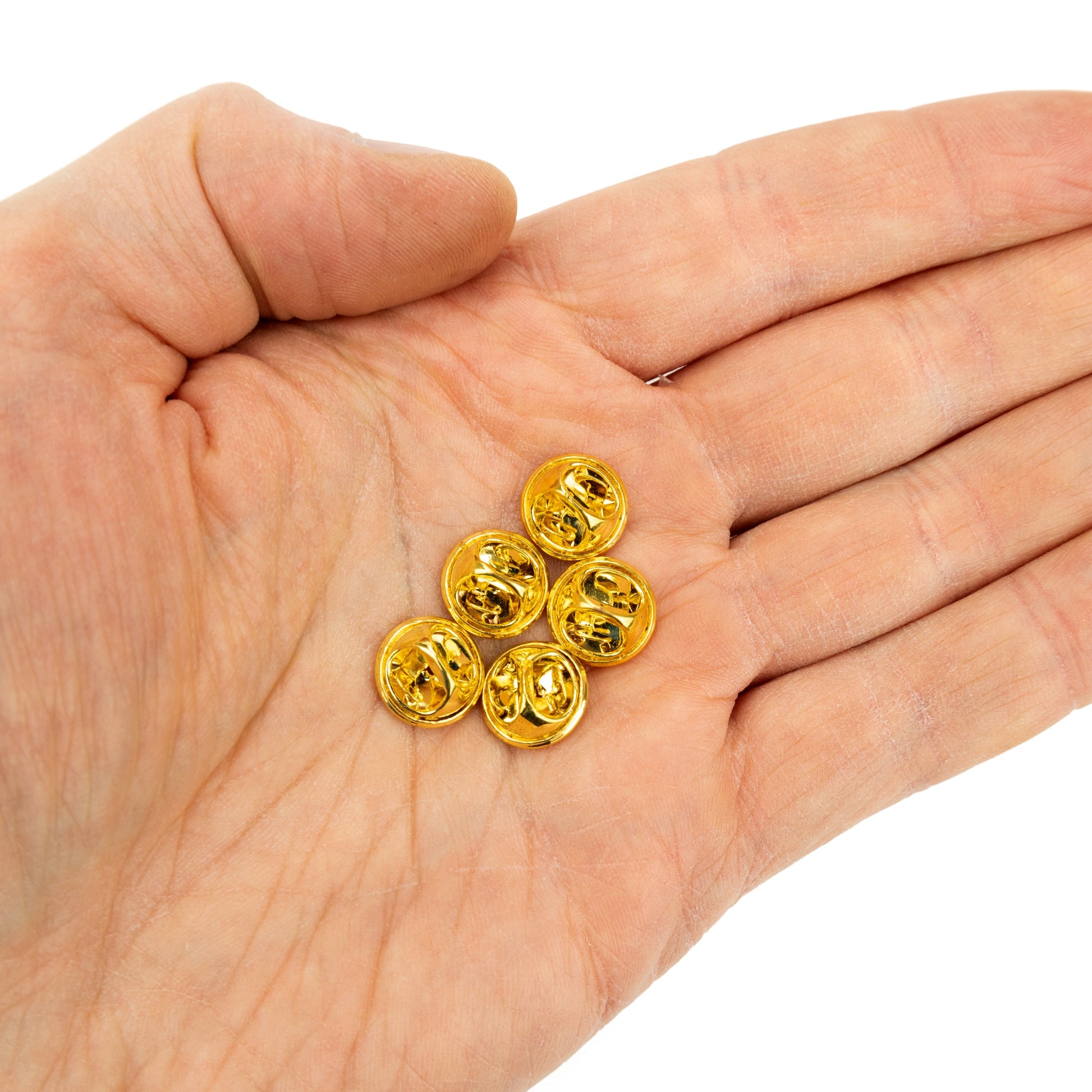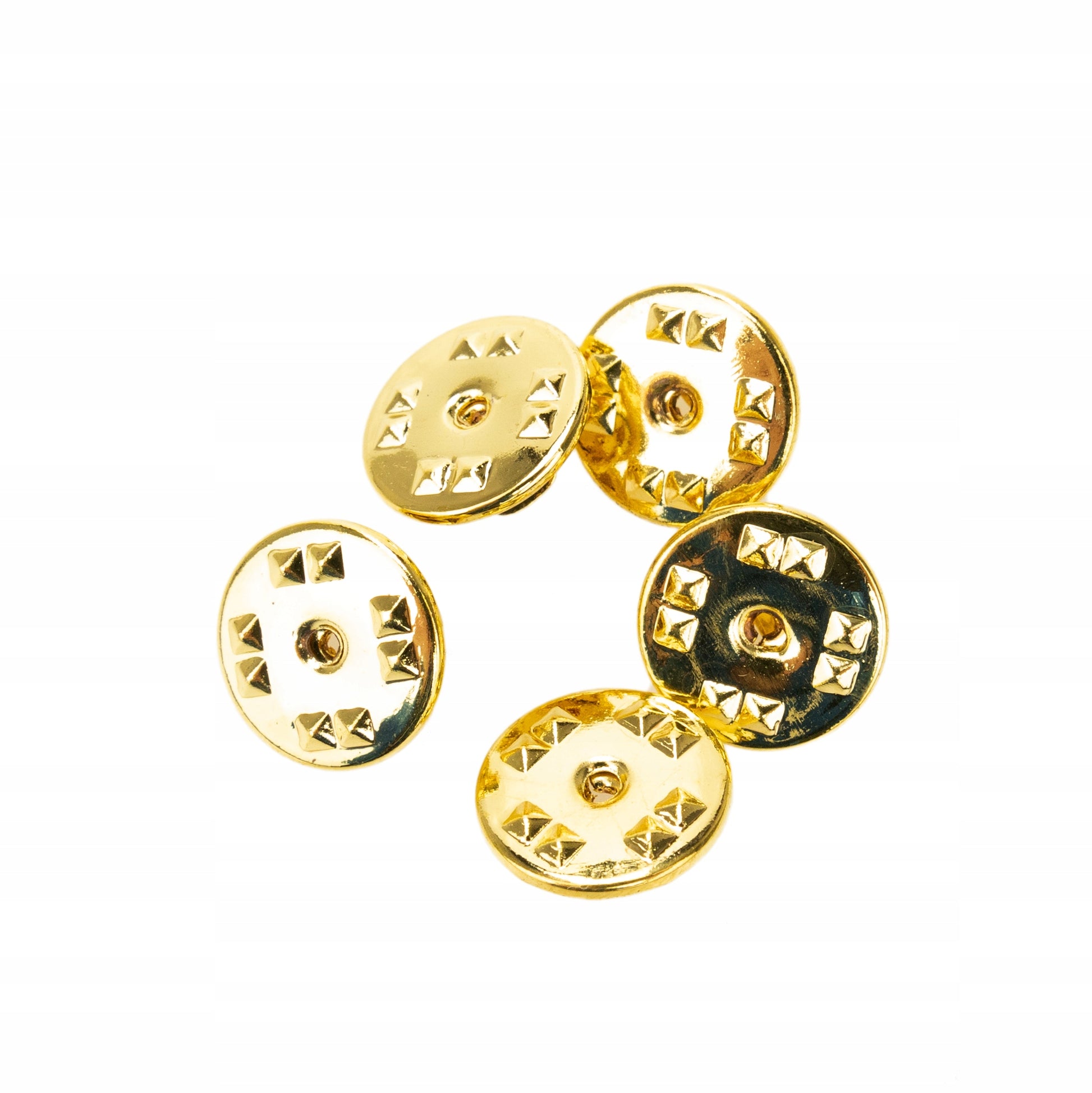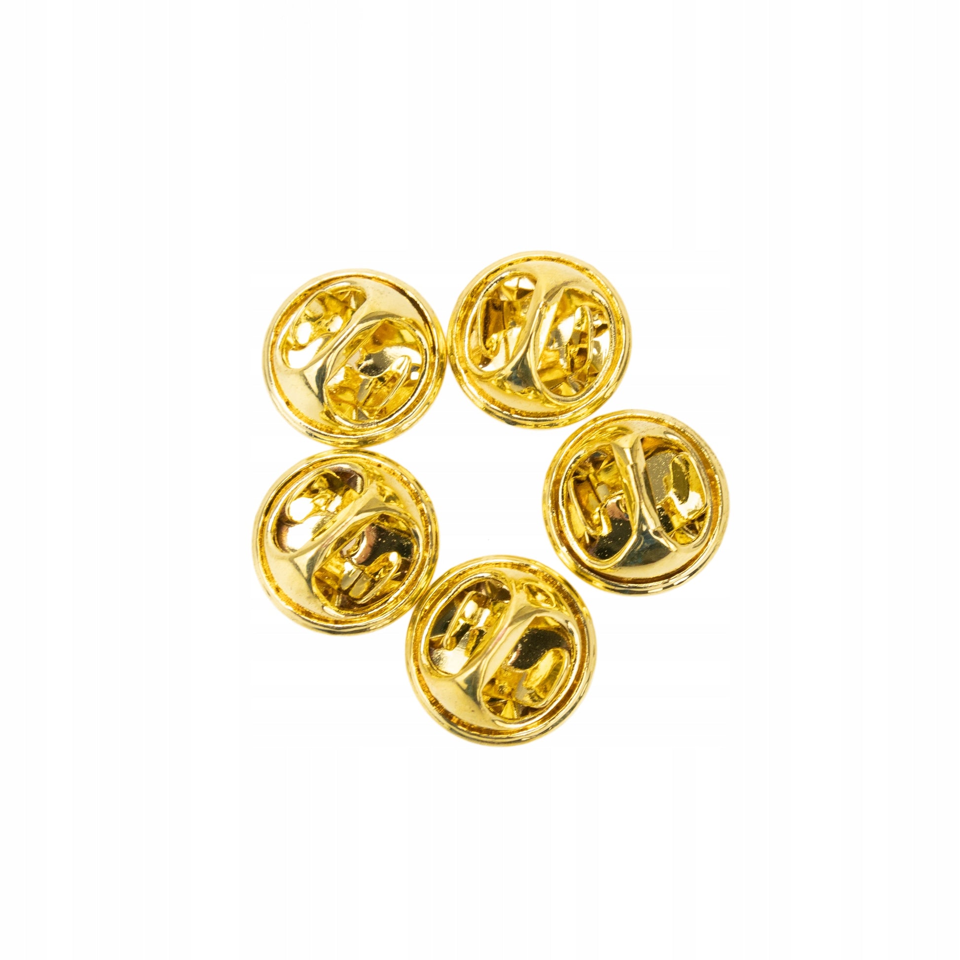 Acest set este format din cinci încuietori fluture aurii, noi-nouțe. Aceste încuietori se potrivesc oricărui model de insignă și au un diametru standard de 11 mm.