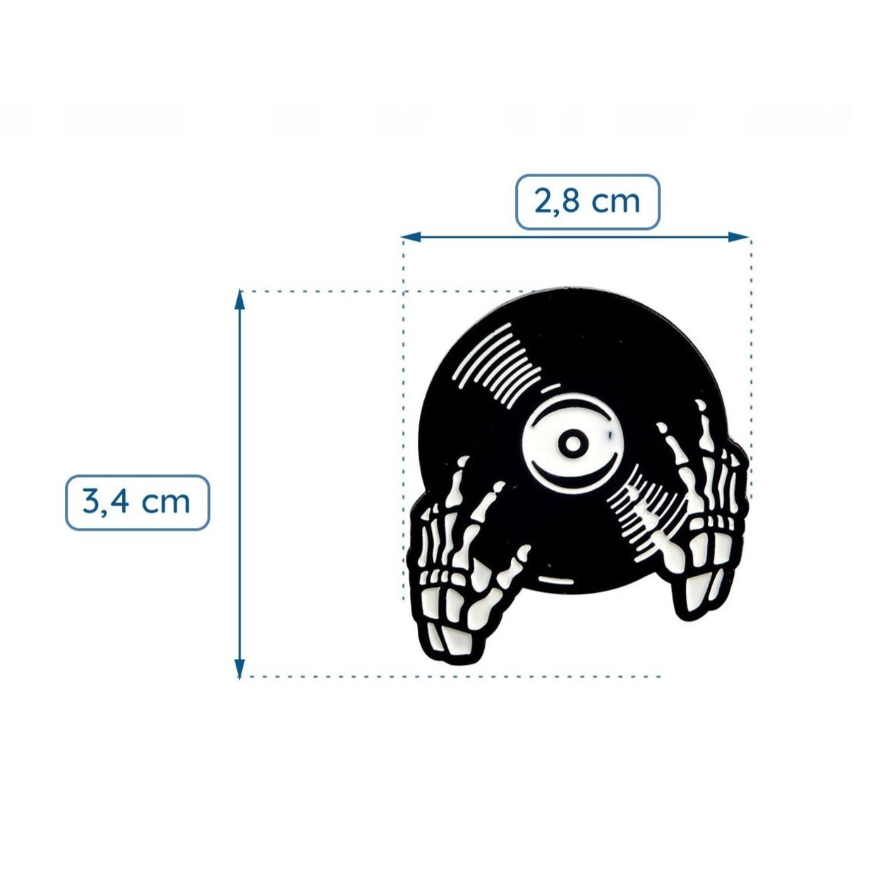 Această broșă decorativă prezintă un disc de vinil negru ținut de mâinile unui schelet. Are o broșă metalică, sau o „clemă”, care permite atașarea ușoară la o jachetă, hanorac, geantă sau eșarfă fără a deteriora materialul.